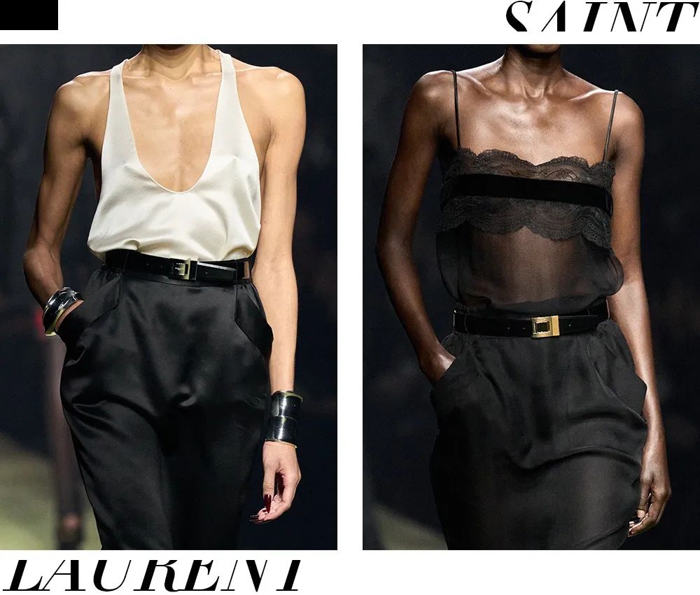 All black对于slip dress来说,是致命诱惑。Saint Laurent在2023秋冬成衣系列中将缎面的矜贵与蕾丝的性感完美融合,模特手臂的肌肉线条是力量,已是性感的最好诠释。