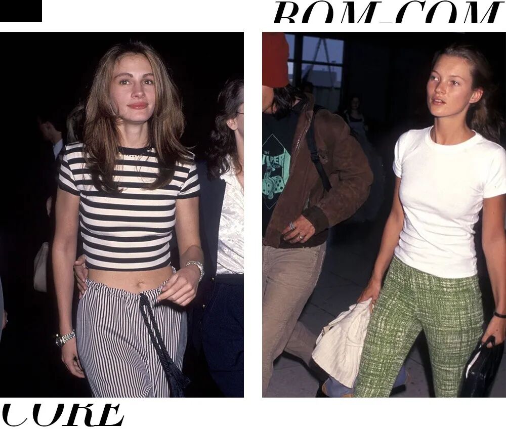 而在浪漫喜剧电影中,只要是牛仔裤几乎都是低腰的,短裙也要将上衣下摆放出来才时髦,那个时候低腰不是流行,是日常。