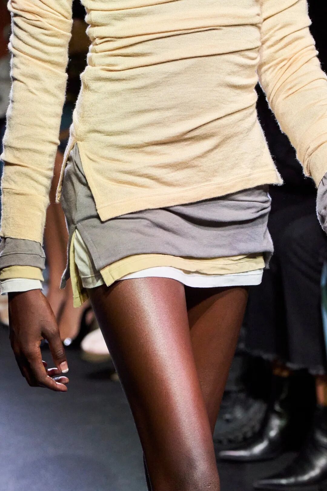 Miu Miu的打底叠搭细节上才见造型师的功力。数不清有多少层的堆叠裙摆、随意塞在精致串珠衬裙的柔软长袖、内裤边外露的知识分子风中裙以及丝袜下隐约可见“不小心”没整理好的上衣边。这些看似随意的造型都经过了精心的设计,简单的打底也可以搭配出八百个心眼子。