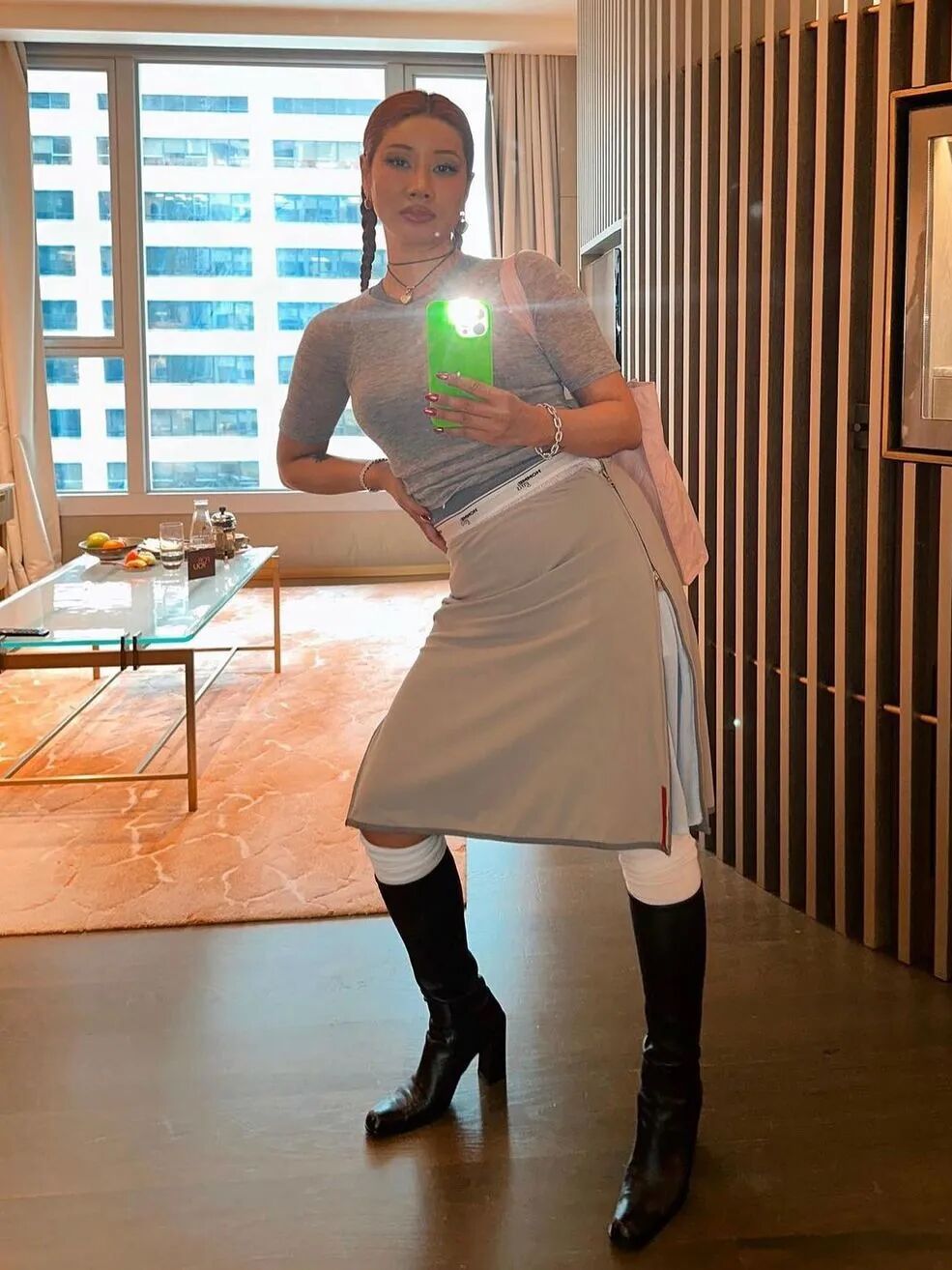 轻薄柔软的材质总能勾起你反复搭配的心。就算没有Miu Miu同款,博主们也能用基础款搭配出Miu式打底感。