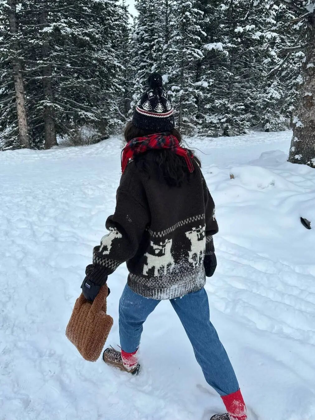 最近在加拿大度假的韩国博主sienne也将穿搭tips带到了北极圈,隔着屏幕也能感受到她嘴里呼出的寒气。在户外更要裹得严严实实,除了必备的保暖三件套,她还会选择厚厚的彩色袜子,与身上的小元素呼应搭配,或者与牛仔裤撞色,一笔小投入就能增强时髦感。