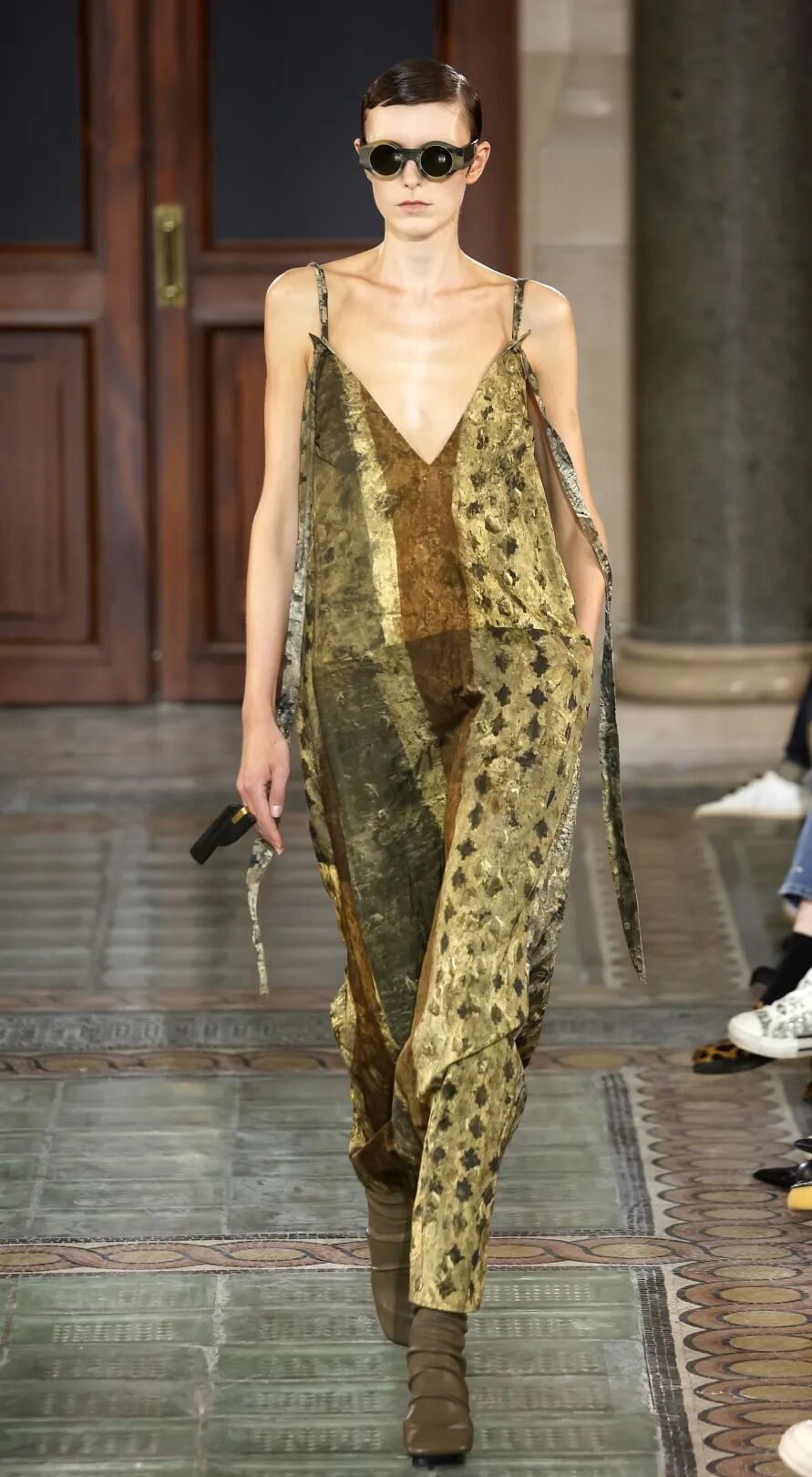 时尚是一个巨大的加减法算式,不信把墨镜“+”进最近正火的风格里试试?加点风格!千禧梦核的魅力在于用复刻风格怀念美好过去,暂时逃离现在的压力。当Y2K的风终于刮到墨镜上,当耳机中响起当年的流行金曲,如同开启时光机,穿越回黄金年代,于是这些镜身纤长而上扬的墨镜,成为了联结过去与当下的媒介,化作当代人的情感寄托。加点自信!墨镜的酷是职场的掩护。当Office Sirens换上西装裙,踩一双尖头高跟鞋和丝袜,出门随手戴上一副墨镜,中和一些性感,增添一些气场,从走进办公楼的一刻就如同在说“姐不好惹”,开会时也更敢于表达自己的不同观点,墨镜之下是职场女孩强大自信的专业素养。加点个性!对于“淡人”来说,墨镜早已与Cleanfit牢牢绑定。与天生骨架大、头小、肩宽的欧洲人不同,白开水穿搭放在亚洲人身上,似乎有点太过平淡(无聊)了。因此,大框墨镜化身时尚加分项上场,无论是all black还是all white,无论熬夜加班的黑眼圈有多深,只需墨镜点缀,时髦加倍,I人狂喜。然而,墨镜的减法美学,在于将极度精致简化为慵懒的morning slow。某个阳光明媚的悠闲周末清晨,随手抓一件衬衫,套上牛仔裤或直接one piece,让皮肤周末也放个假,素颜配上小椭圆框墨镜,似乎加了一层20世纪90年代的复古滤镜,解开的扣子和墨镜自带不疾不徐的松弛气氛。That’s weekend!但如果抛开纯粹的时髦属性,对普通打工人的日常而言,墨镜其实只不过是一种劳保用品。作为防晒刚需,不在鼻梁,就在头顶,甚至还可能出现在几天没洗头的帽子上。一件大牌衣服可能穿不了几次,但一副大牌墨镜却可以百搭,不仅能为打工人提供性价比,更重要的还是容貌安全感和敢于面对真实自我的勇气。有人调侃:“在一线城市,眼睛不再是心灵的窗户,墨镜才是众人灵魂的深渊。”当在地铁站遇到头顶架着墨镜、手拿咖啡、步履匆匆的都市丽人,擦肩而过的瞬间可能会发现她今天素面朝天,并没有远处看上去那样精致,今天可能是她每周固定的“makeup free日”。用素颜+墨镜缓解时刻紧绷的状态,如今的女孩们正在去容貌焦虑化,对过度精致祛魅,卸掉厚重的妆容,她们笑得更漂亮。作为时髦风向标,2024春夏秀场上的墨镜似乎不走寻常路,千奇百怪,脑洞大开。“怪”大胆的。科幻片中的墨镜走入现实什么样?Balenciaga先锋的锋是疯狂的“疯”,看起来上下颠倒,流线型的270°环绕“5G”墨镜,总觉得“戴反了”,Acne Studios则将废土风进行到底,镜片更大,包裹更严实,就算柳絮漫天也不必担心迷眼睛。左:Balenciaga 右:Acne Studios
