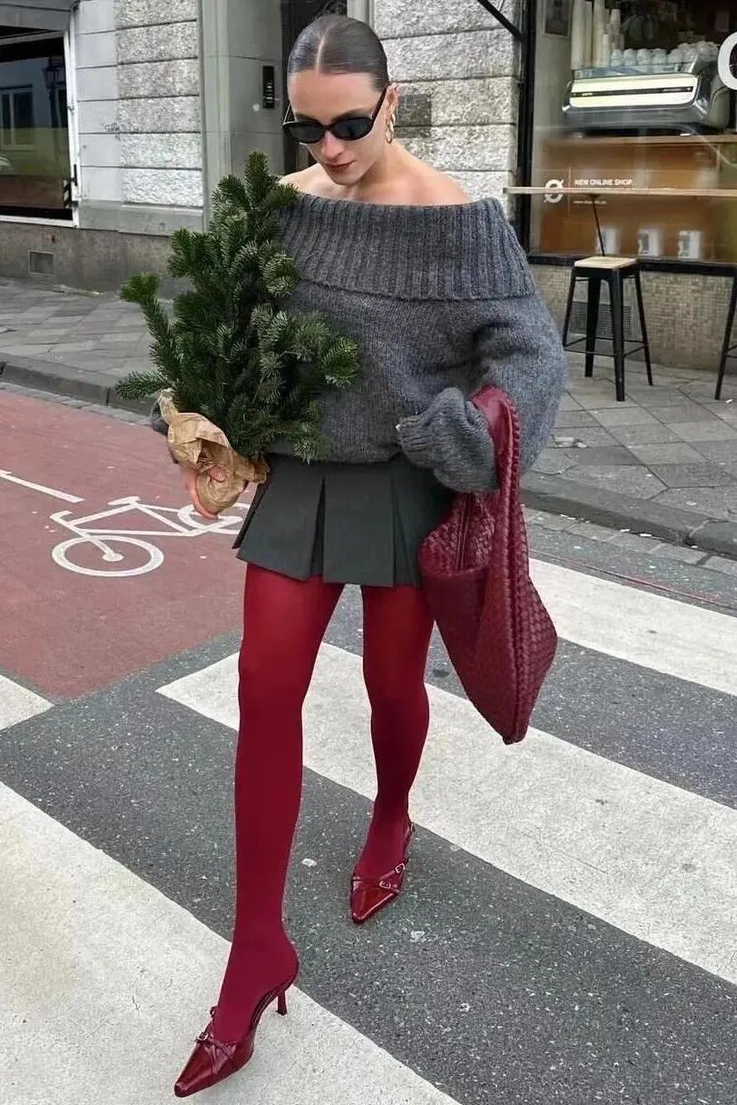 同样是用红色配饰作点缀,搭配黑色丝袜又别有一番韵味。在丝袜包裹下,笔直修长的双腿若隐若现,在红与灰之间增添一抹魅惑的色彩。无论搭配厚底小皮鞋还是尖头高跟鞋,都尽显女性独有的游刃有余。
