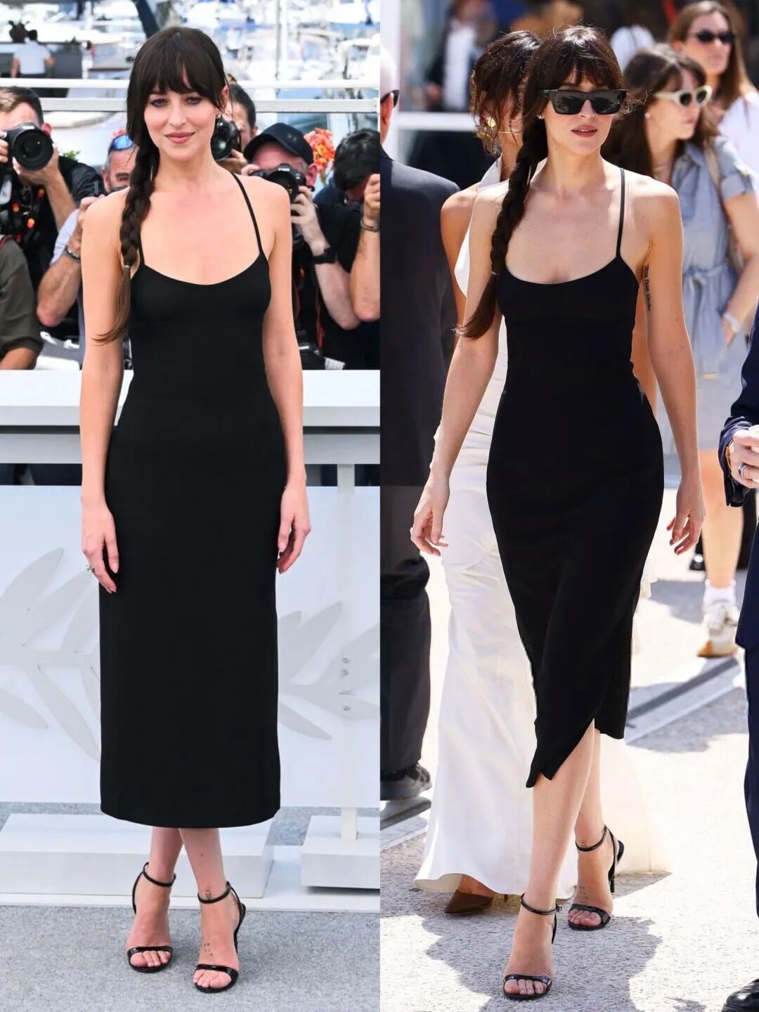 去掉太过的花哨,再弱化“精致感”,比如这身紧身的连衣裙,黑色和刚刚到脚踝的裙子长度,正好牵制住性感的浓度,清爽的长辫子更让整个造型显得松弛轻盈。