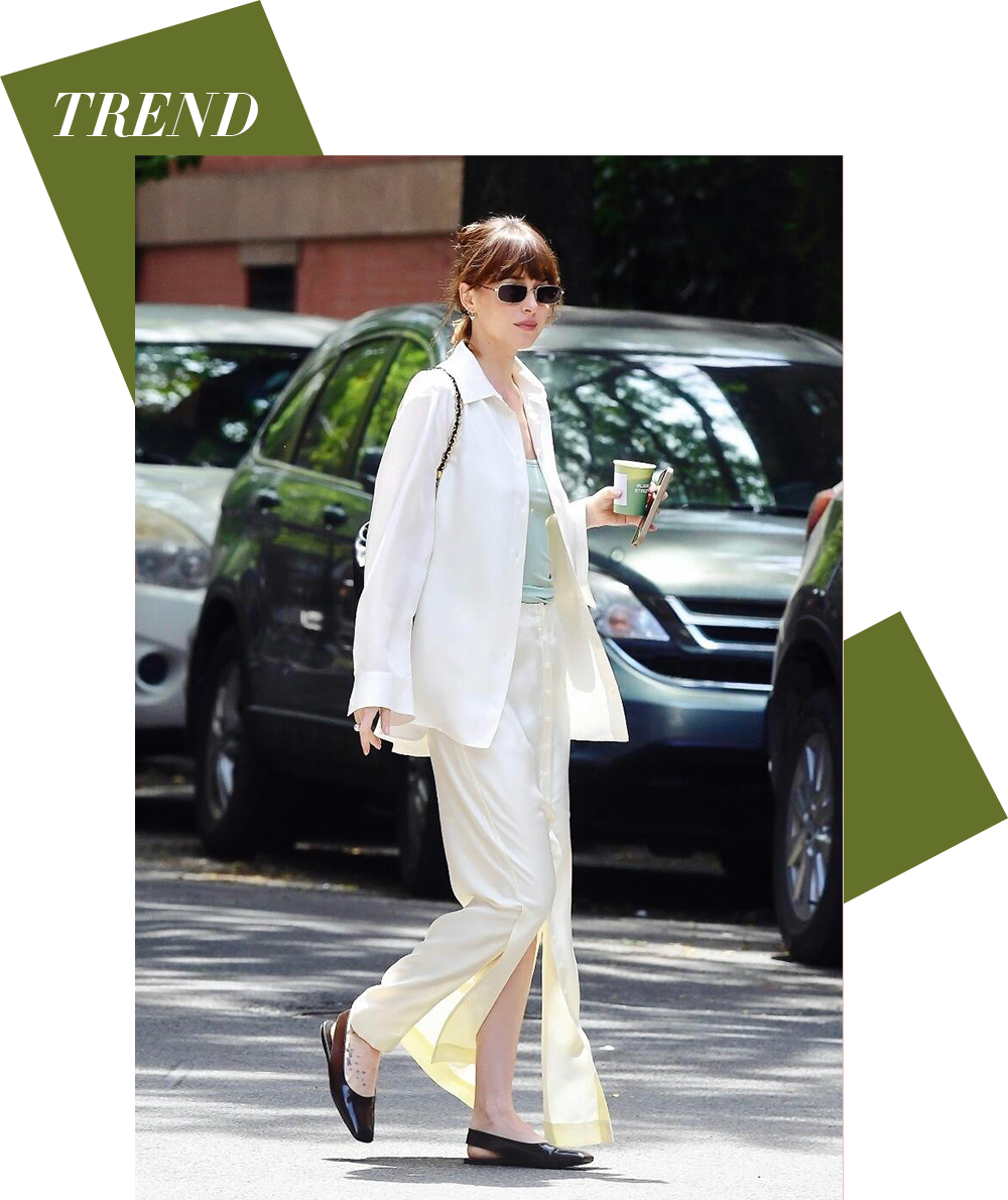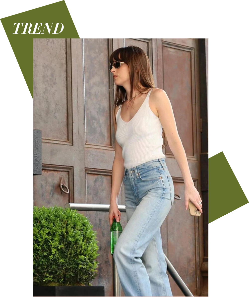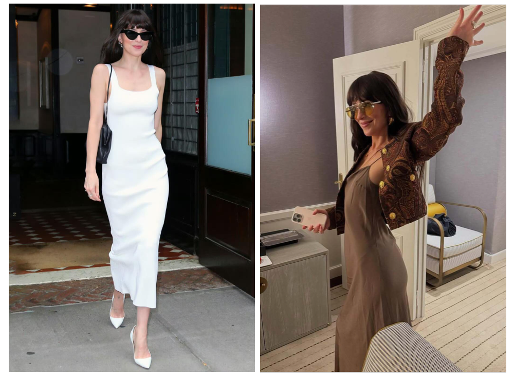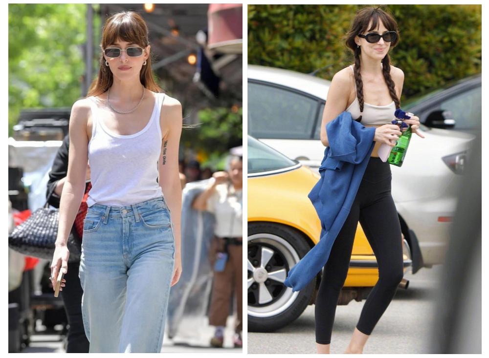 即使是白色吊带搭配浅色牛仔裤的日常穿搭,在质感上的选择,Dakota Johnson也很会弱化“刻意感”,用舒适面料和宽松剪裁,替代过于用力的时髦造型,让整体造型既有呼吸感又不失优雅。