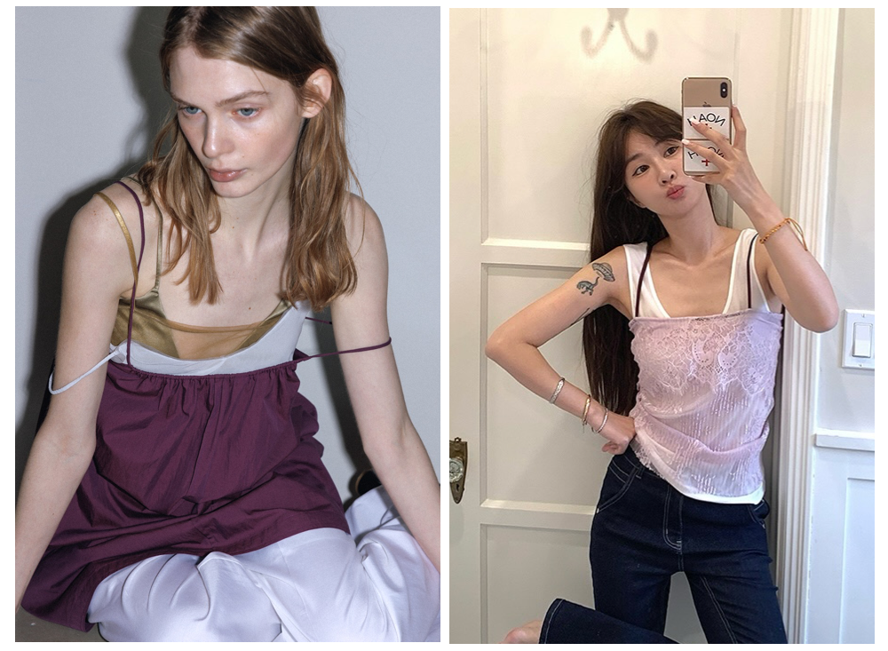细带吊带背心如果再增添一字领高领的设计,领口恰到好处地包裹前胸,强调出骨感的肩颈和修长的脖颈至锁骨线条,整体气质则会更偏向沉静内敛的文艺感,也足够清爽高级。
