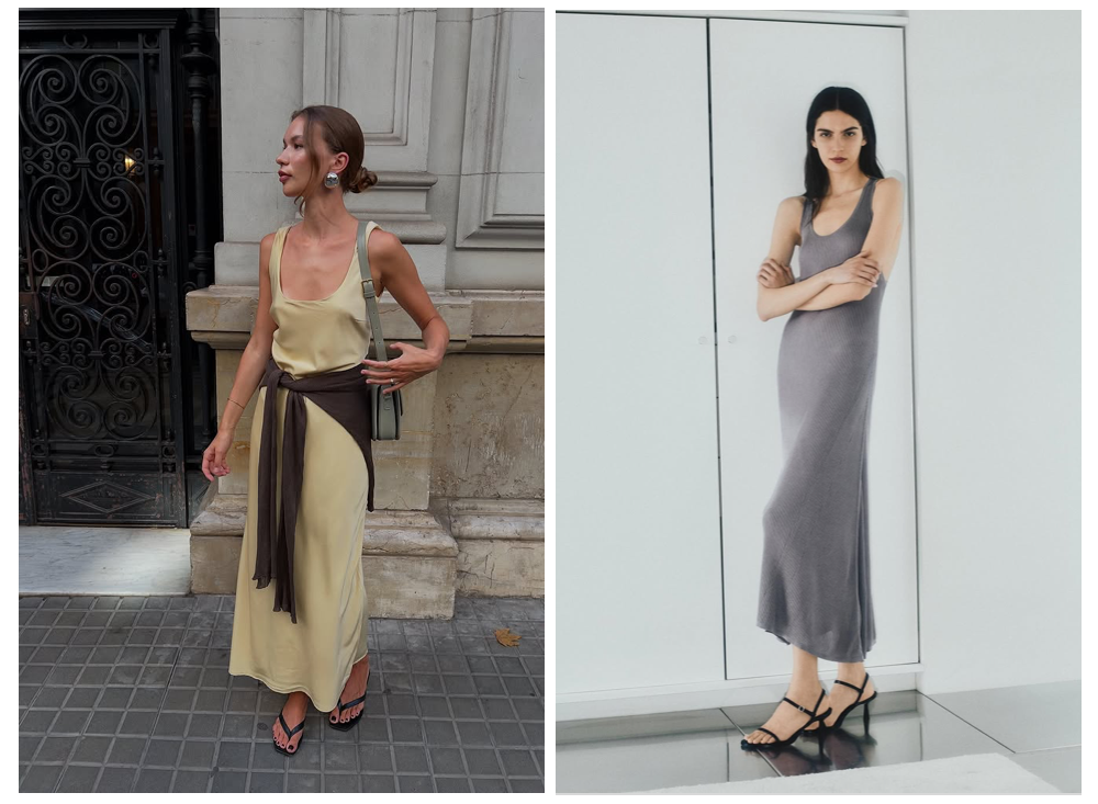 U字形领口的紧身裙则更能修饰整体身形,最简洁的线条展现“冷感”穿搭中克制的性感,领口横向延伸的线条能在视觉上拓宽肩部,避免头重脚轻,让身材曲线看起来更加自然。