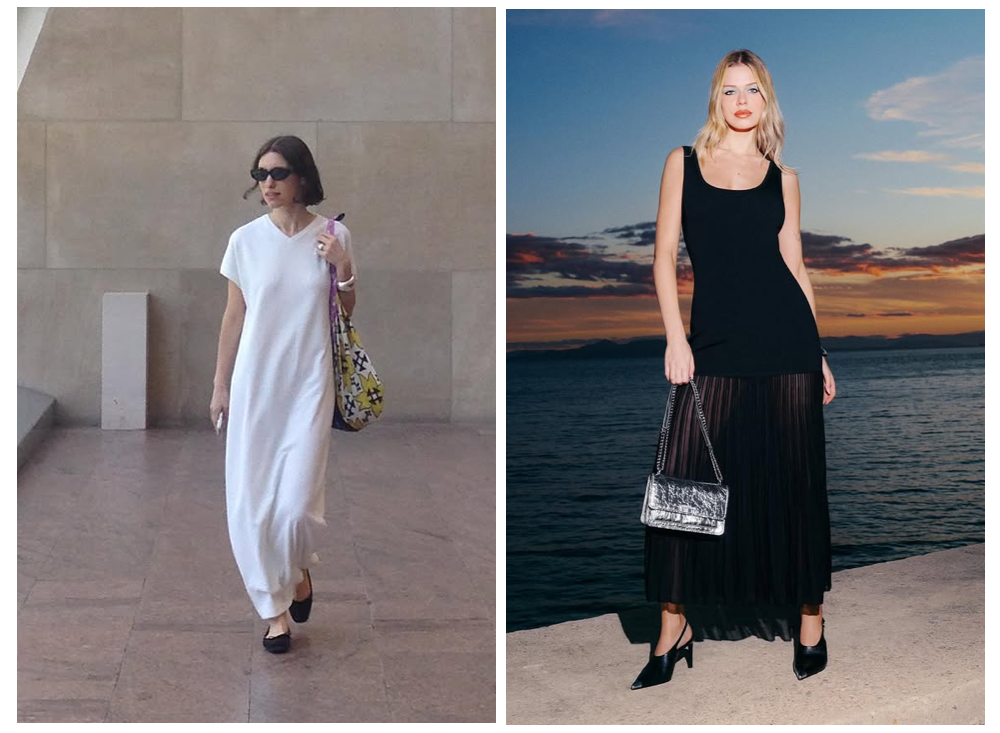 略微宽松的长裙,一直是很显身材的单品,若担心淹没身材比例,只需一条细腰带即可化解,将腰带松散地系在自然腰线处,既能勾勒隐约曲线,又保留裙摆的流动感,形成张弛有度的轮廓。
