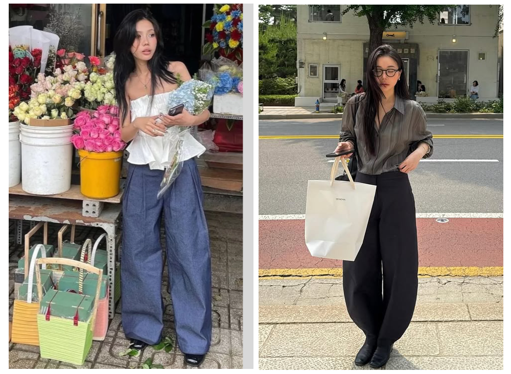 弯刀裤在近两年也很流行,特别流线设计能巧妙修饰臀腿线条,而收窄的裤脚则在视觉上拉长比例,搭配最简单的oversize衬衫,也能穿出超模般的飒爽步履,慵懒又洒脱。