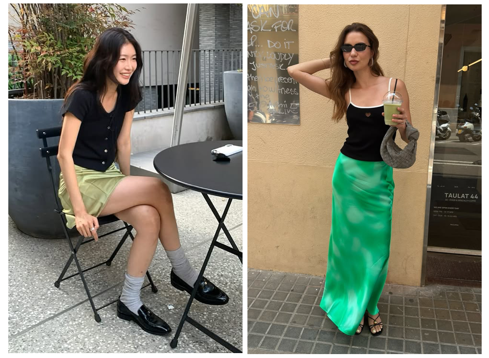 内敛的光泽,也是提升质感的方式之一,带有柔和哑光或缎面光泽的半身裙,本身就蕴含着低调的奢华感,上身只需搭配最基础的黑色吊带背心或短袖开衫,衬托出半裙优雅的光泽流动,同时也能稳住整体基调。