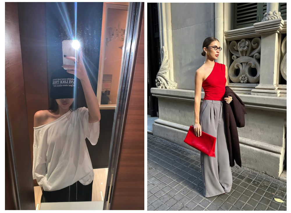 斜肩上衣的单肩设计,可以露出一侧锁骨与肩线,松垮的落肩款式,搭配廓形工装裤或束脚运动裤,瞬间注入慵懒的时髦感,如果是紧身弹力的面料,则能完美勾勒肩颈与手臂线条,立刻转向优雅洒脱的气质。