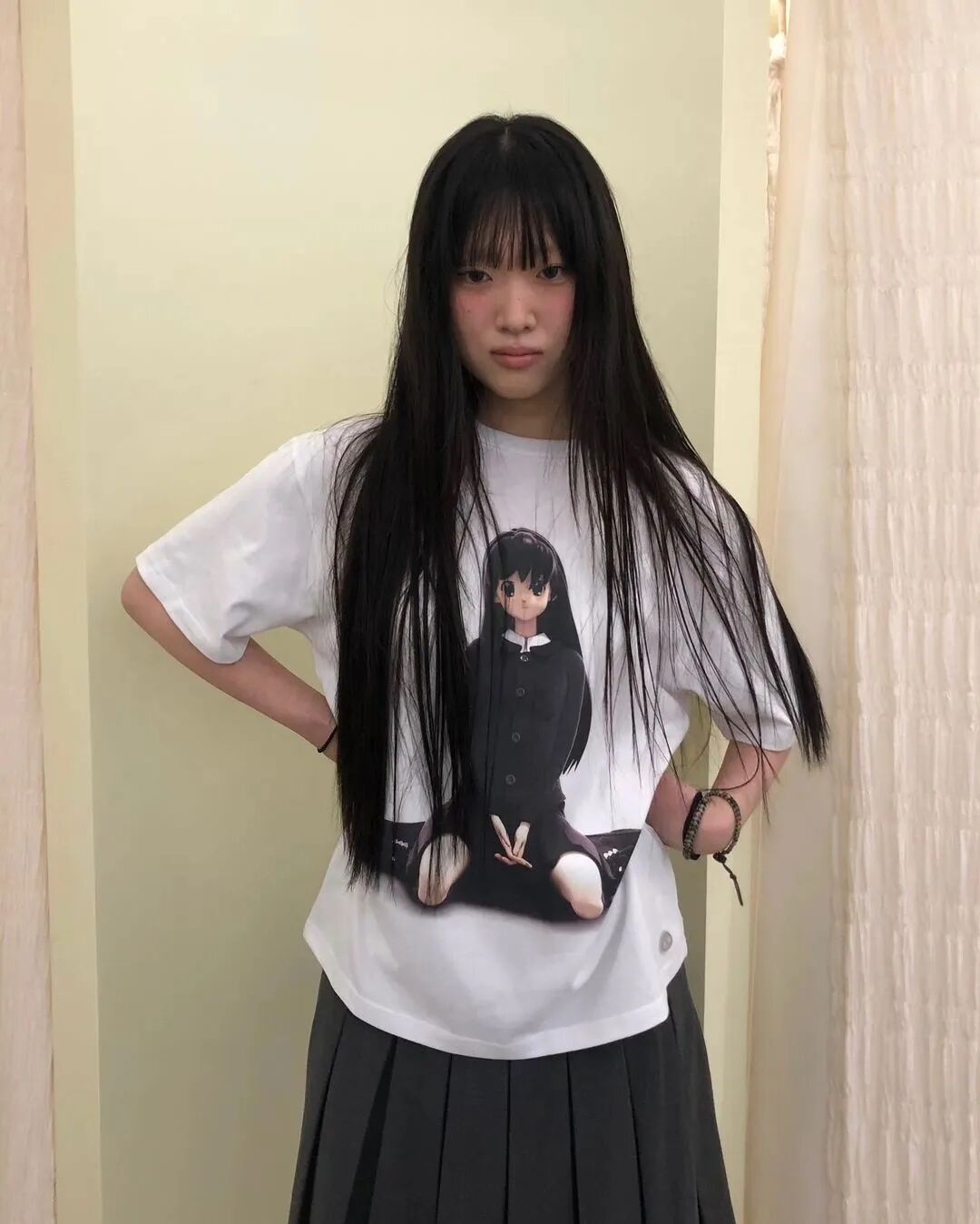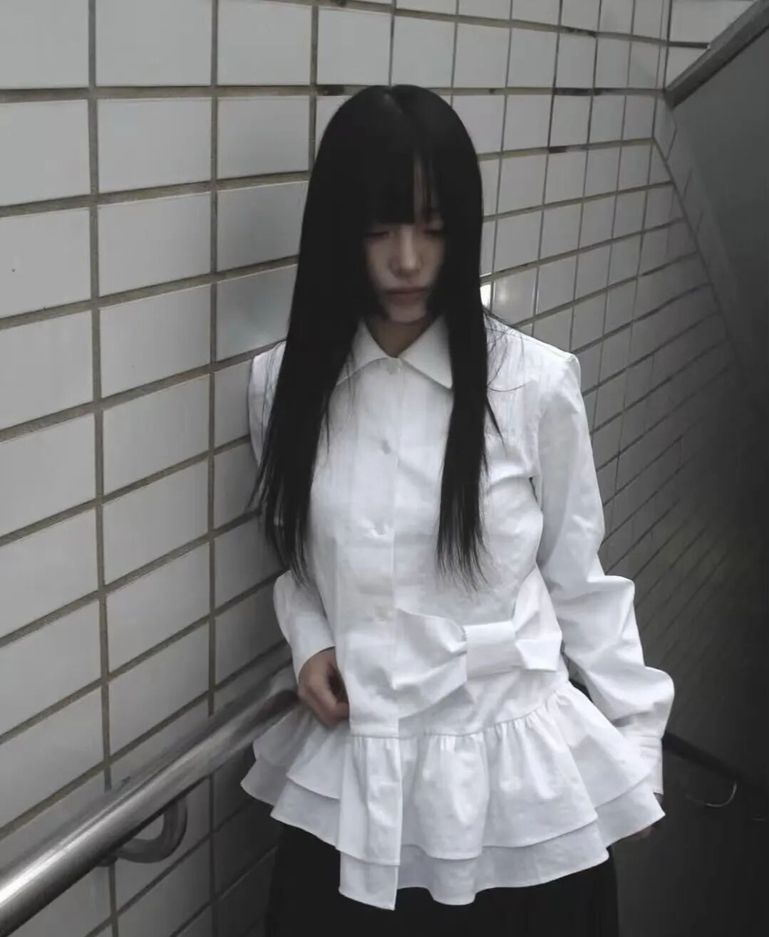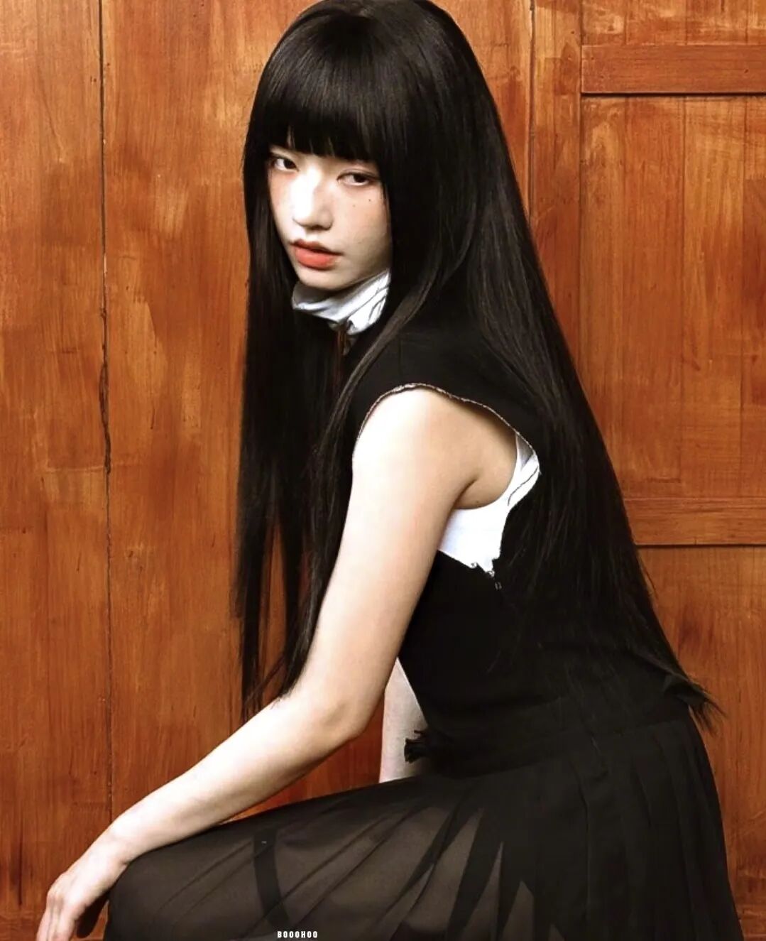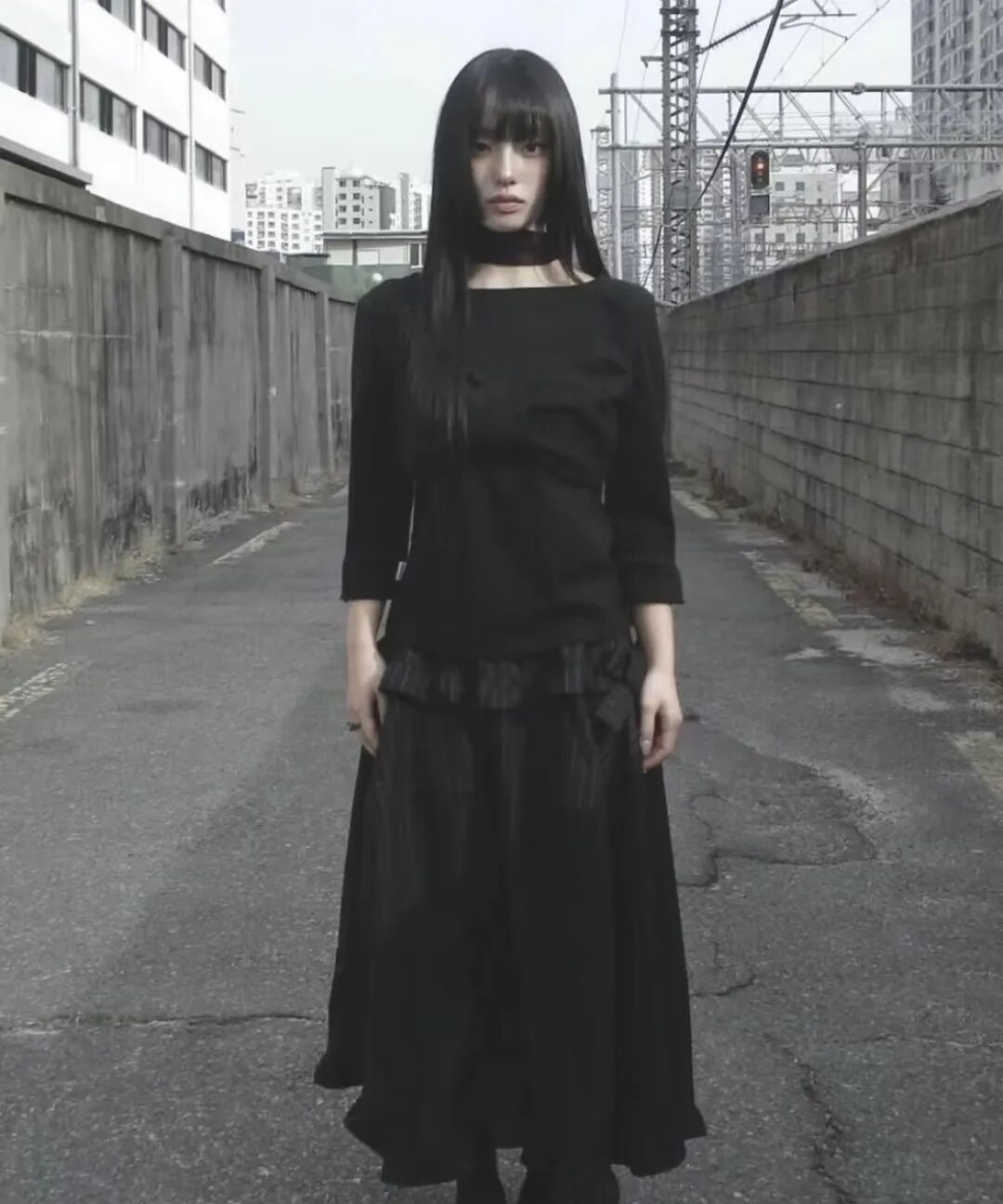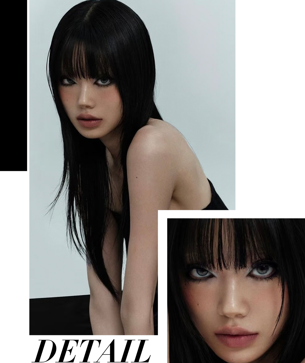 这种齐刘海+黑长直+黑白灰的日漫造型,被称为“新富江少女风”。在当下的韩国流行文化语境中,这股穿搭潮流正席卷从女团、博主到Z世代的社交平台,把“少女感”“危险感”“反叛美”完美融合。它从漫画走向现实,从虚拟视觉投射到具体服饰,成为2025年最令人迷恋的“异色少女风”。