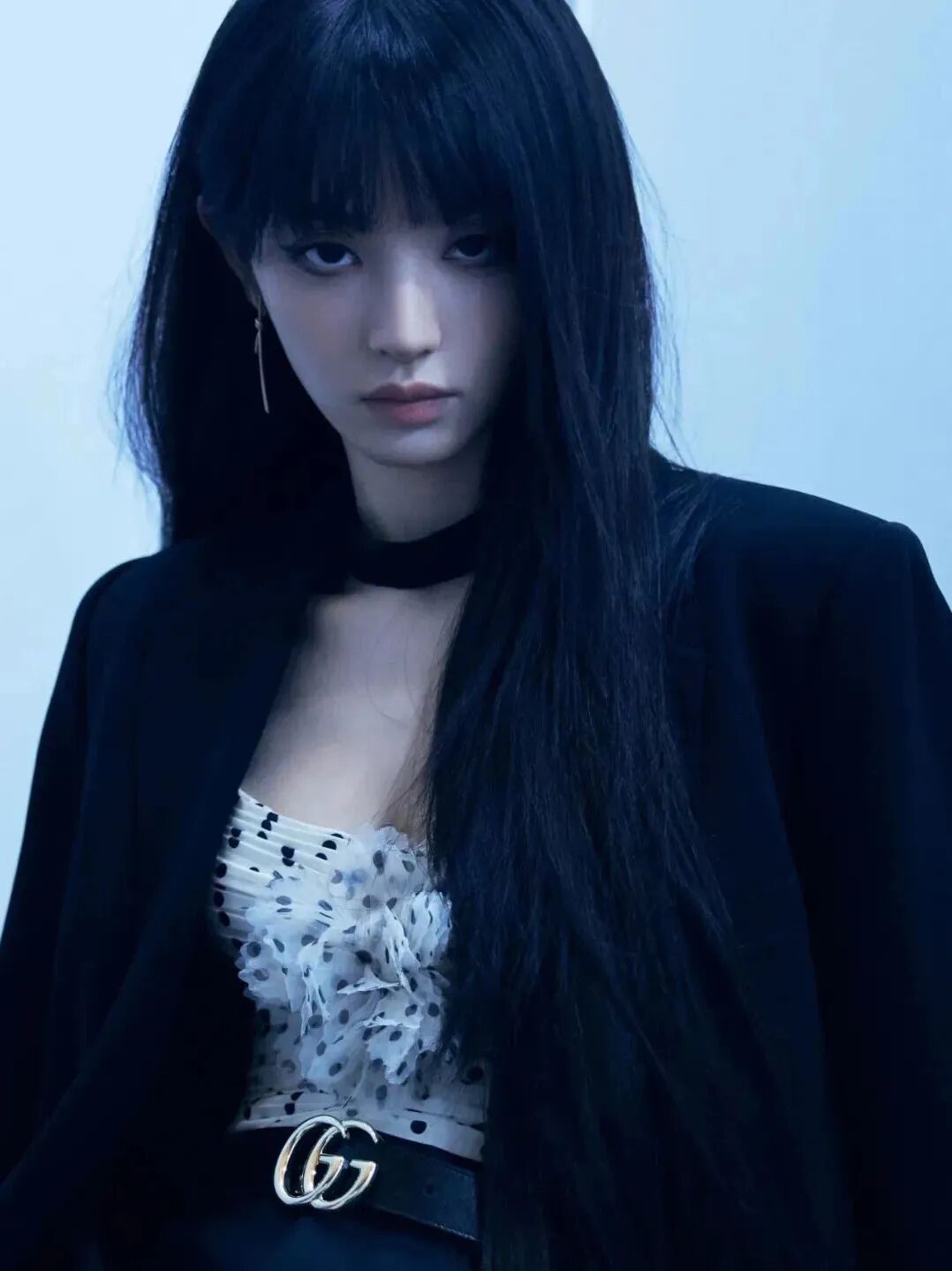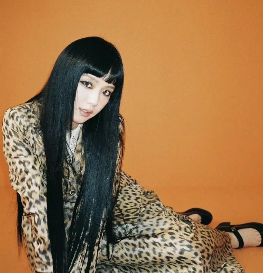 像BLACKPINK基本全员都有过新富江少女风的造型:Jennie在万圣节的时候就cos过《杀死比尔》中的Gogo。一向有铁刘海之称的这种黑长直发型加上黑色小香风套装是Lisa一直以来的甜酷风格。Jisoo也没落下,全包眼线和深色眼影让她的新富江风更具神秘和危险气质。