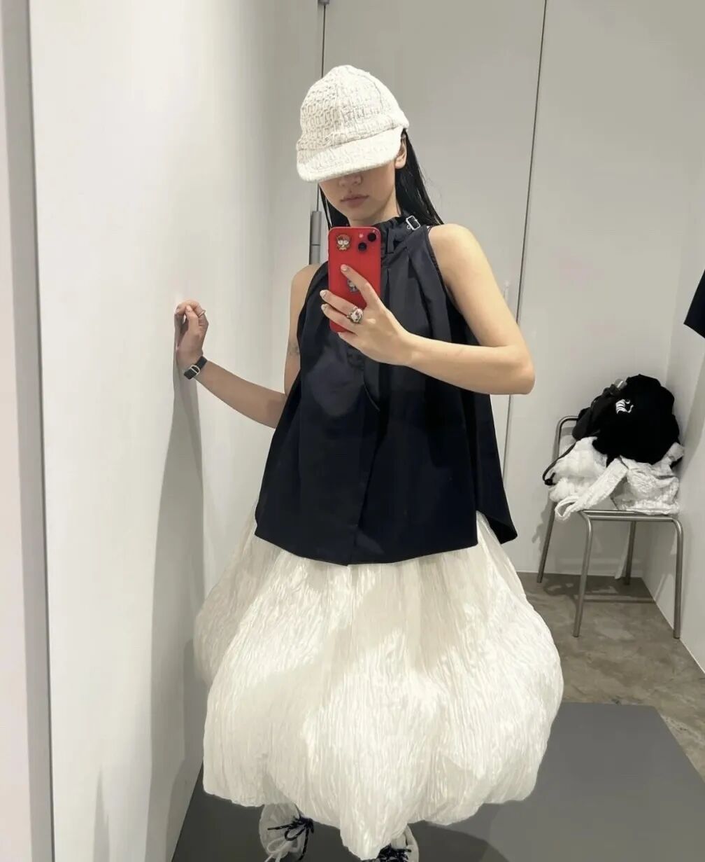 这种融合了川久保玲式的极简怪诞、黑色文化与Miu Miu少女解构的造型风格,张力极强。