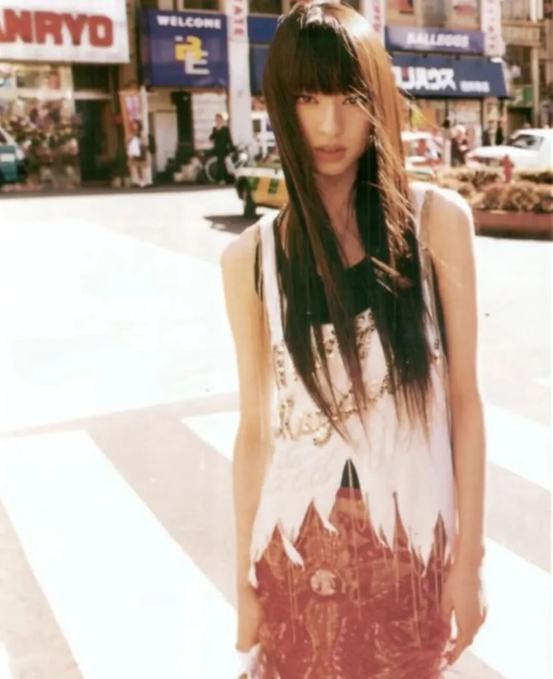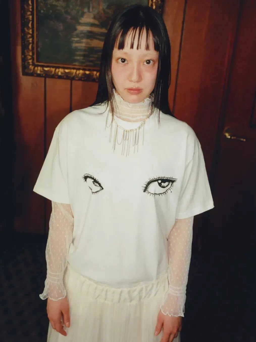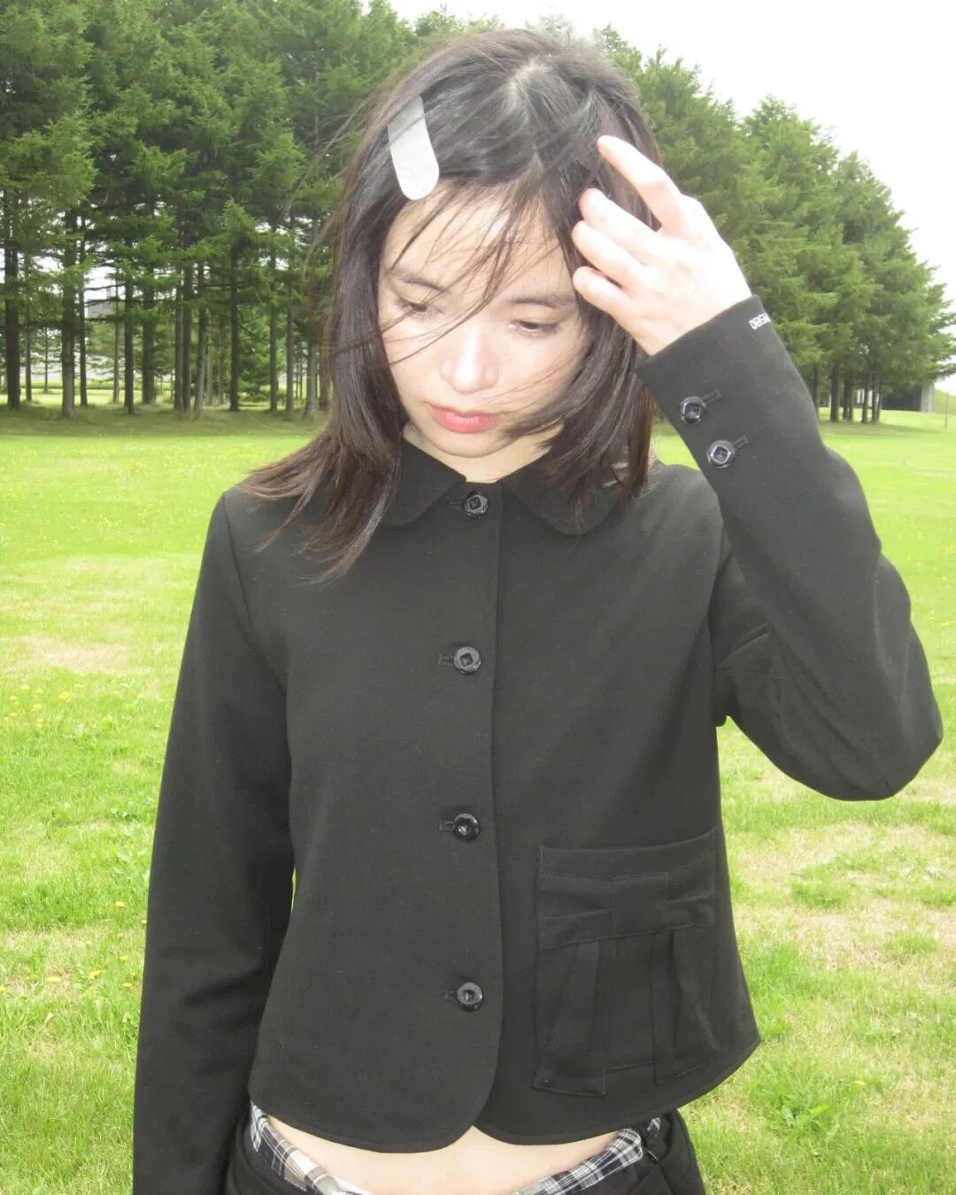 在发型上,中长黑直发成为标志性选择,搭配薄刘海或不对称发卡,制造“少女感中的不协调美”;有时也会选择20世纪90年代感十足的半扎小辫子、复古发箍等带有日漫意味的造型。