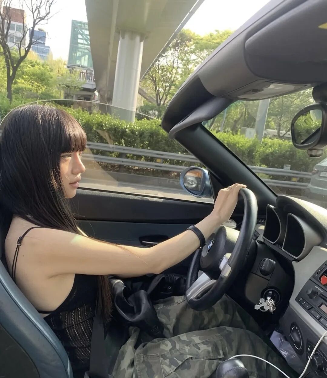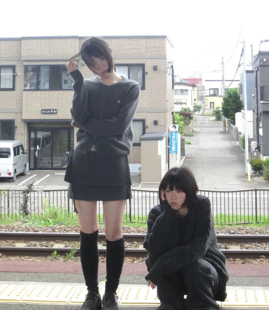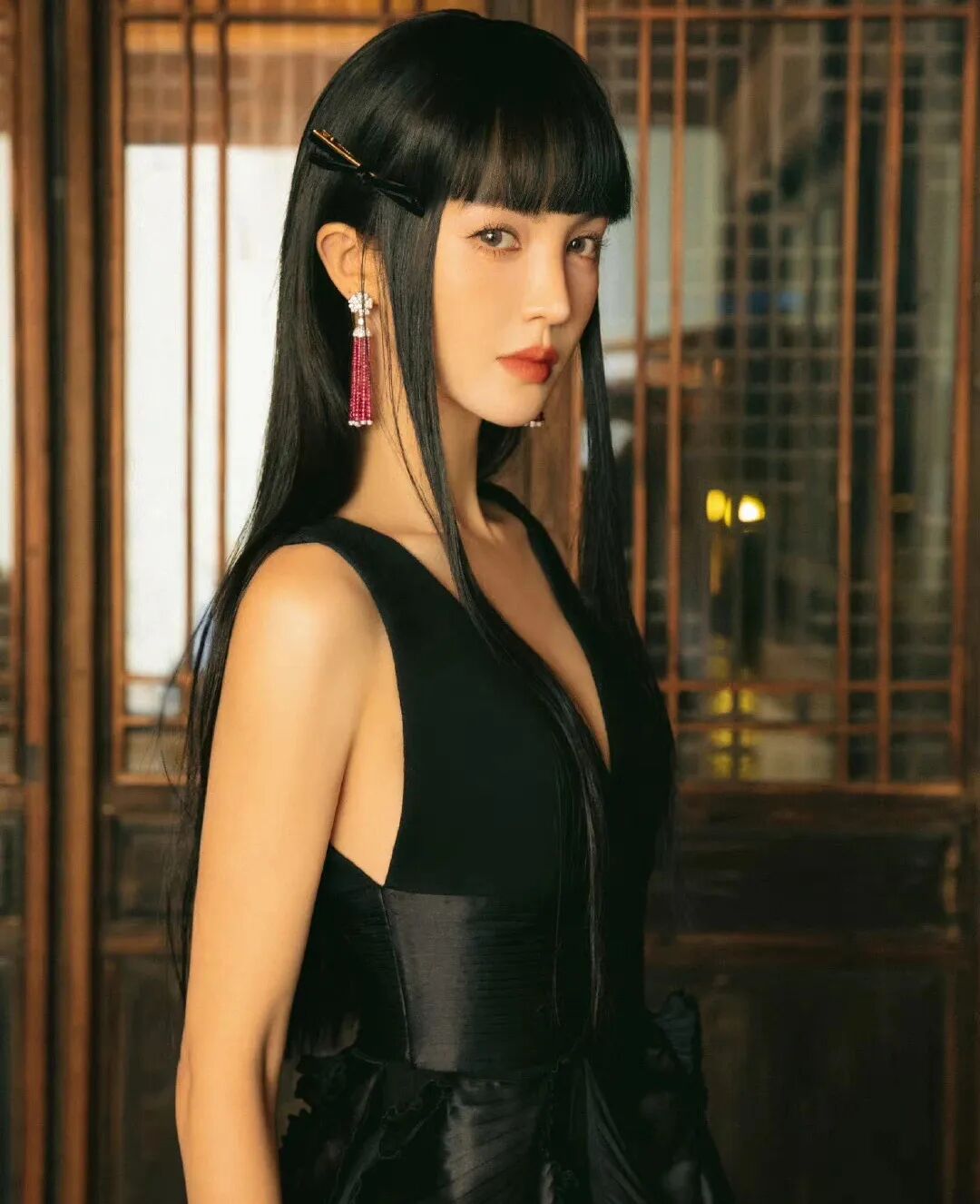 在发型上,中长黑直发成为标志性选择,搭配薄刘海或不对称发卡,制造“少女感中的不协调美”;有时也会选择20世纪90年代感十足的半扎小辫子、复古发箍等带有日漫意味的造型。