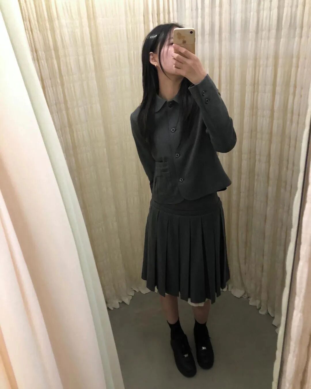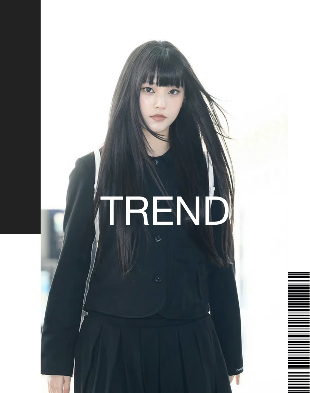 比如NewJeans成员Haerin的机场出发照,就曾经因为「人间富江」的氛围登顶小红书热搜,这套是新富江少女风非常具有代表性的日漫女高的「黑色制服」。
