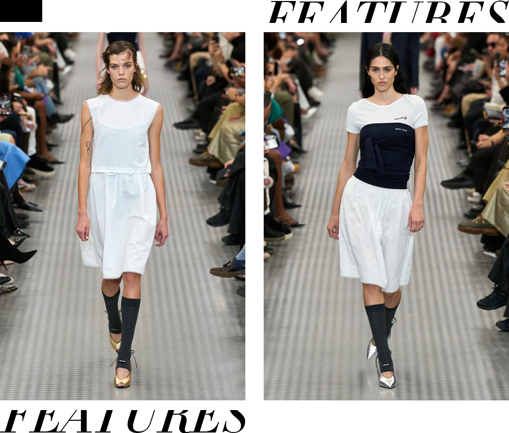Miu Miu SS 2025虽延续甜美学院风,却在细节中加入了脏旧染、残缺剪裁、破损处理与失控感,强化了“乖乖女崩坏”的印象。