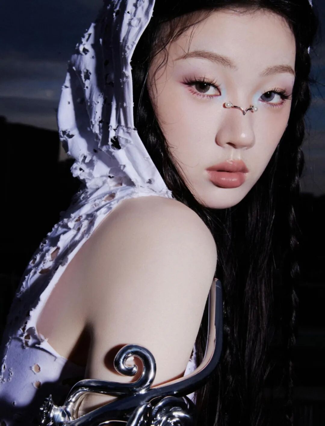 直发的利落线条配冷感妆容,是Y3K标志性灵魂。眼线偏爱不规则曲线或尖锐几何棱角,唇妆以水润玻璃感提亮未来调性;水钻、星芒等装饰元素与发型、妆容呼应,精准拿捏复古未来美学。