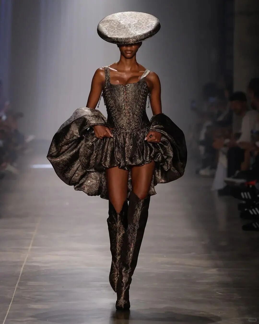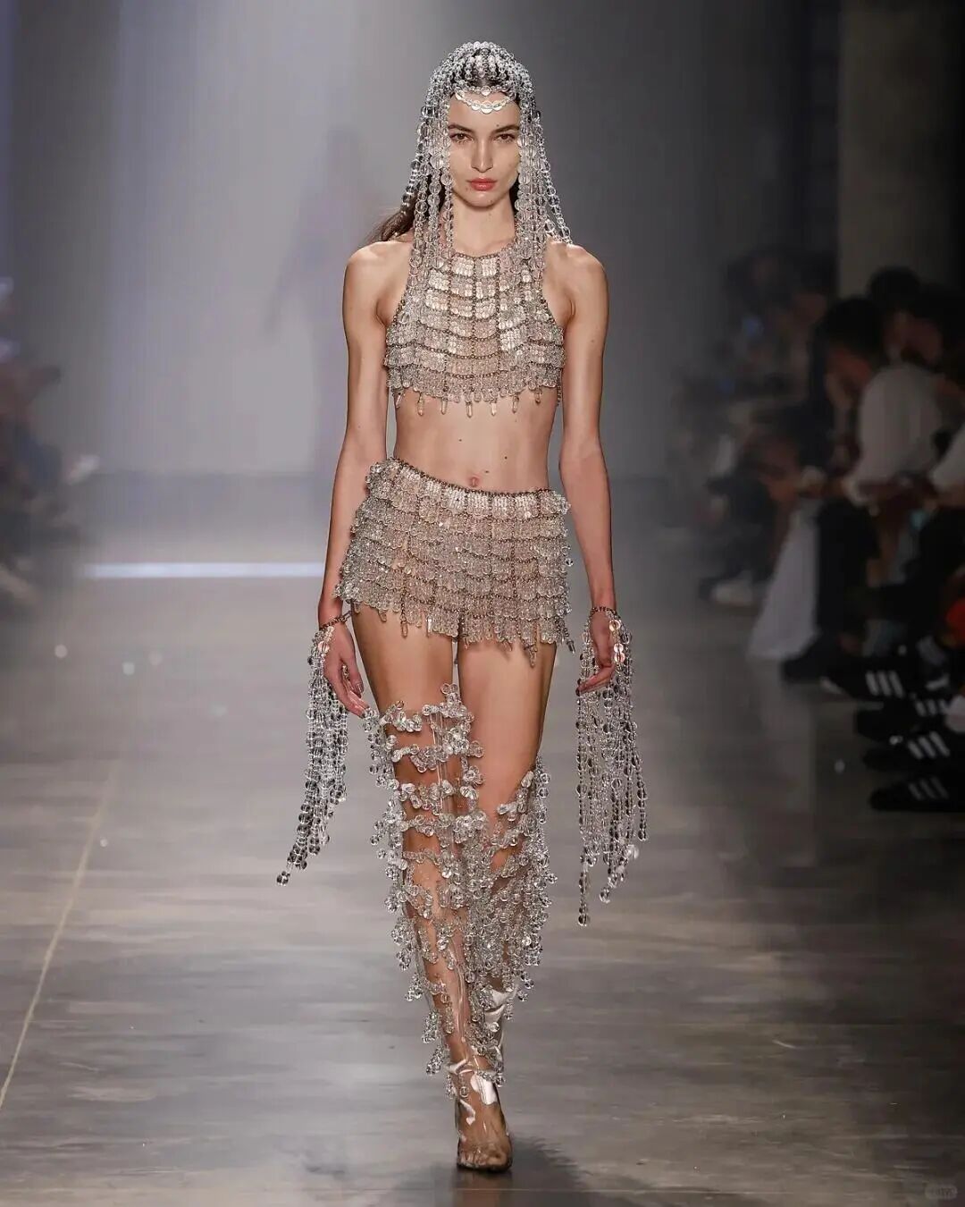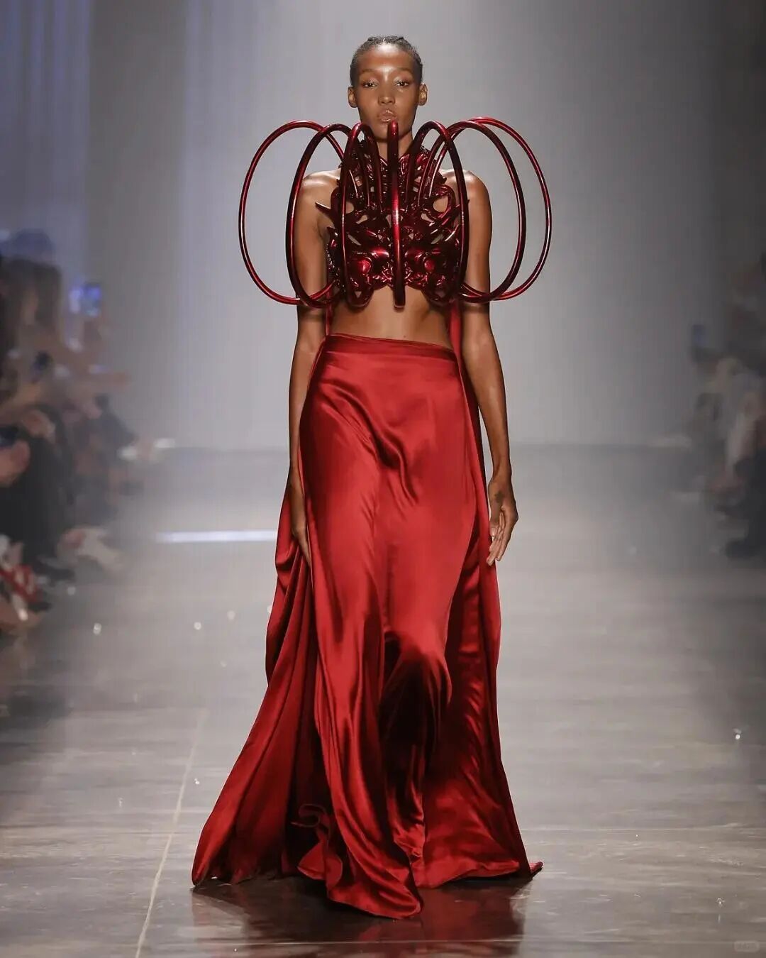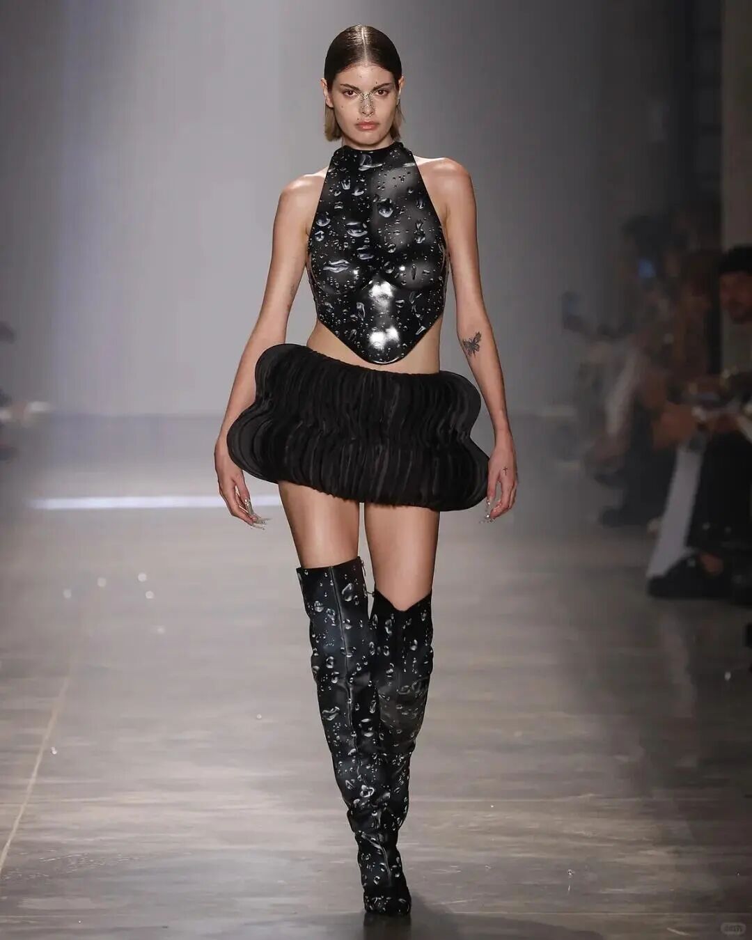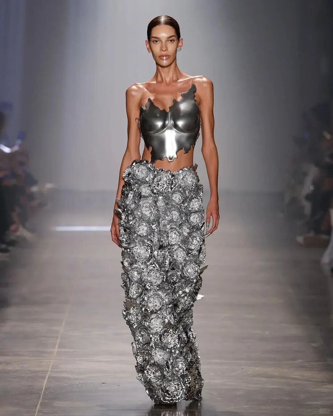Artemisi 2025春季系列通过3D打印、手工皮革板、水晶和金属应用等元素,创造出一系列独特的服装,如渐变刺绣紧身胸衣、液态效果裙子和带有金属装饰的皮革外套。