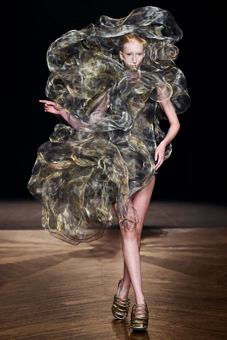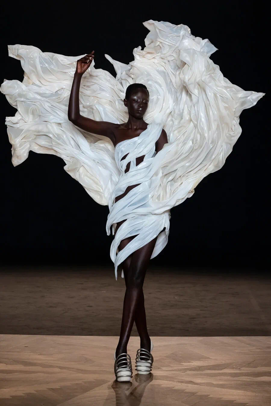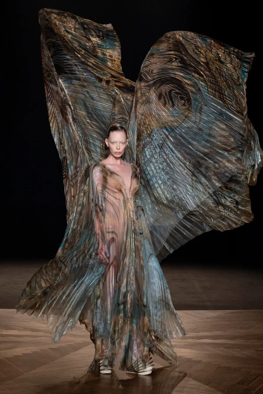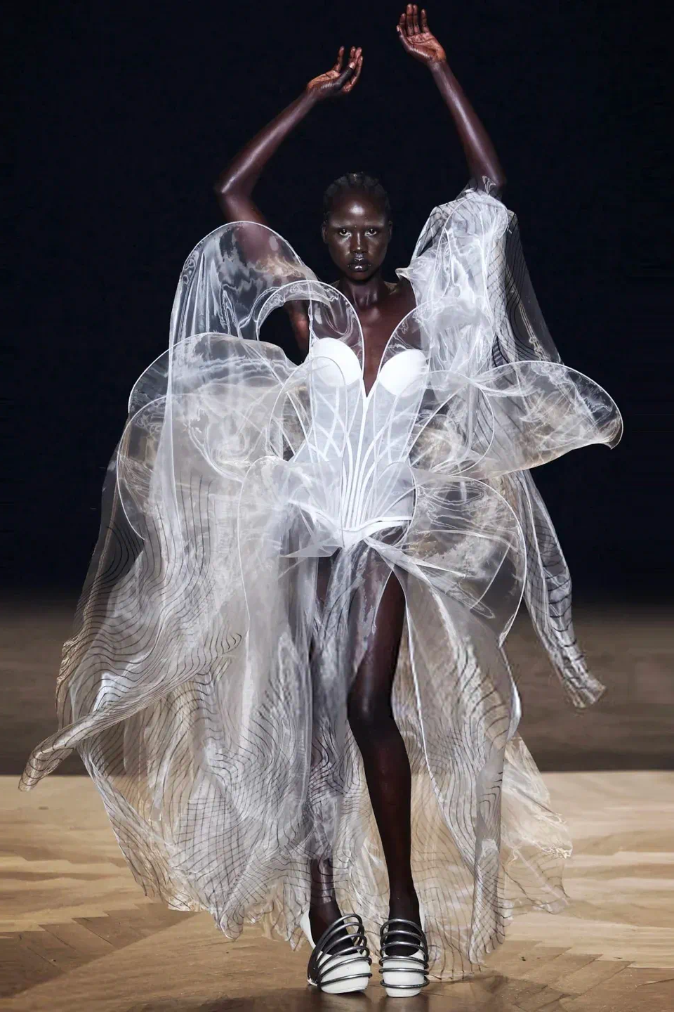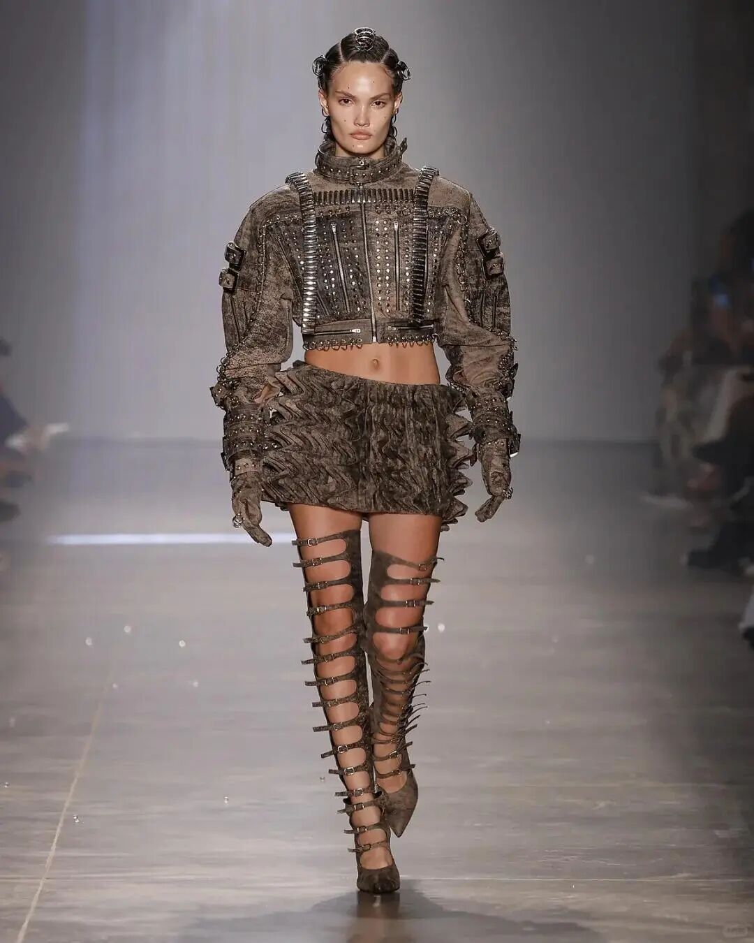 Artemisi 2025春季系列通过3D打印、手工皮革板、水晶和金属应用等元素,创造出一系列独特的服装,如渐变刺绣紧身胸衣、液态效果裙子和带有金属装饰的皮革外套。