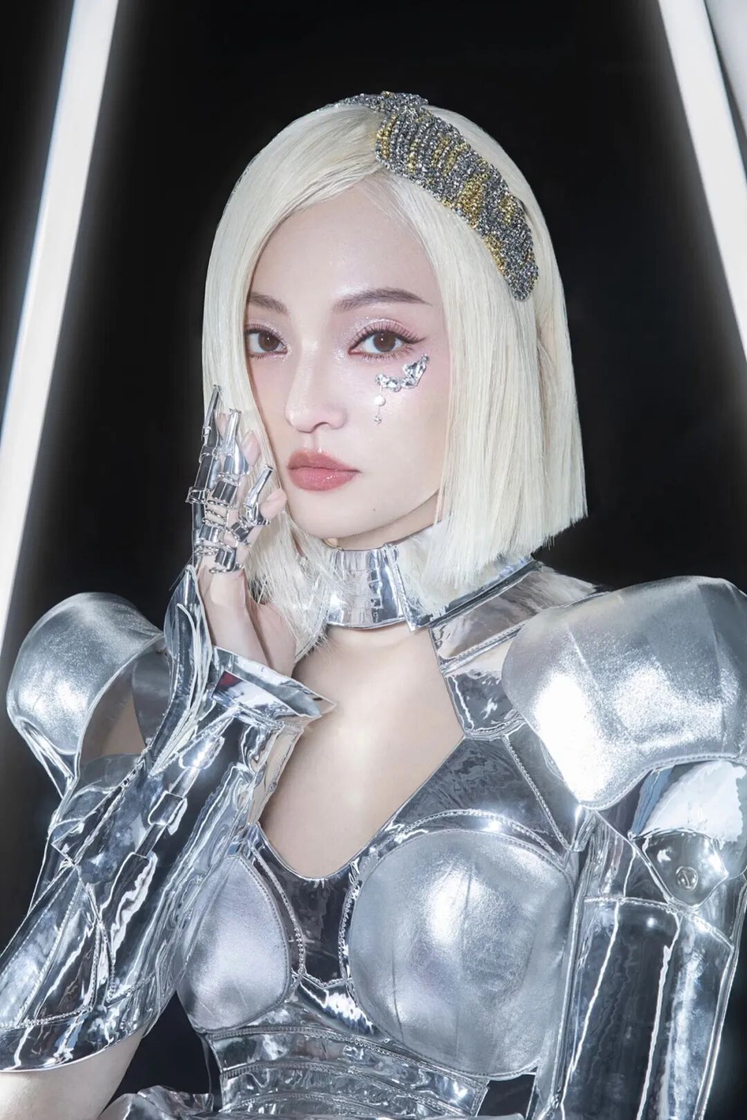 “百变女王”张韶涵在演唱会上就曾经上身过一套「机械姬」造型,银白发色搭配赛博风格金属战甲,精致的妆容和金属盔甲戒指细节满满,冰冷的机械风与时髦的未来感融为一体。