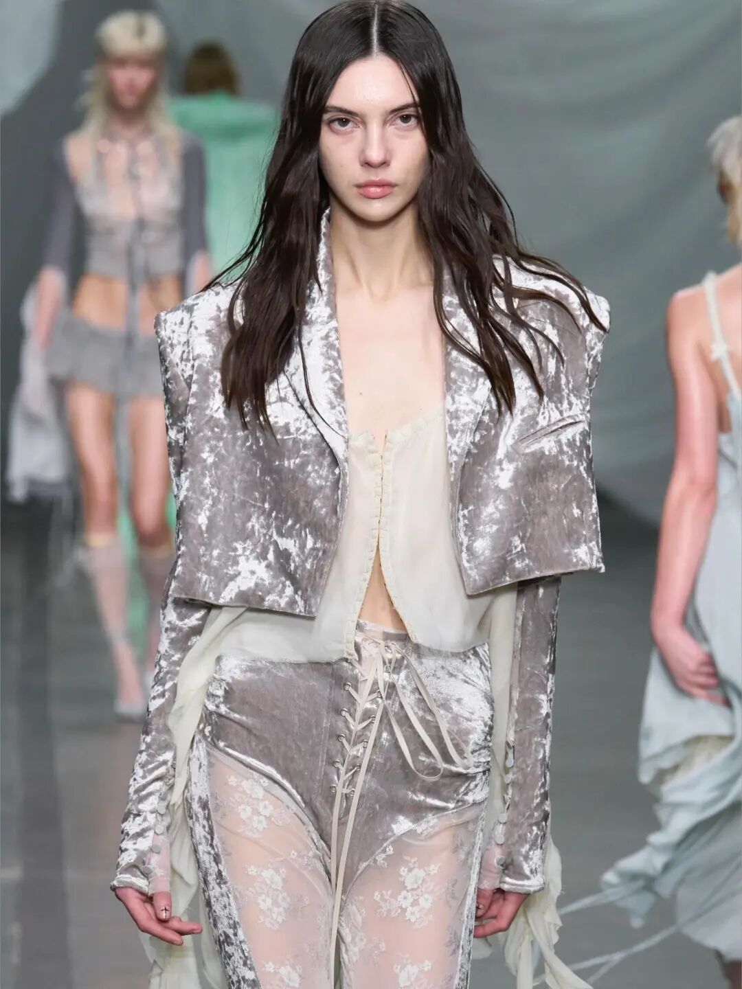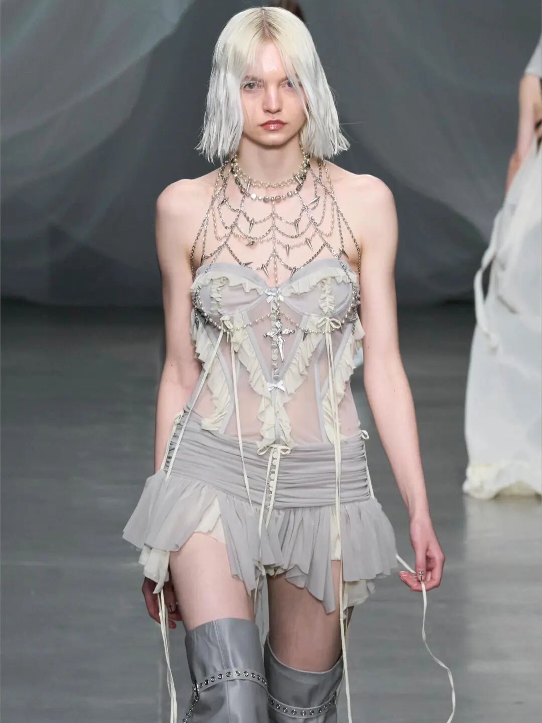 Y3K美学热衷于挑战常规的服装廓形。不对称的剪裁、夸张的立体肩线、扭曲的拼接设计,都暗示着物理规则并非一成不变,万物皆可拆解重构。