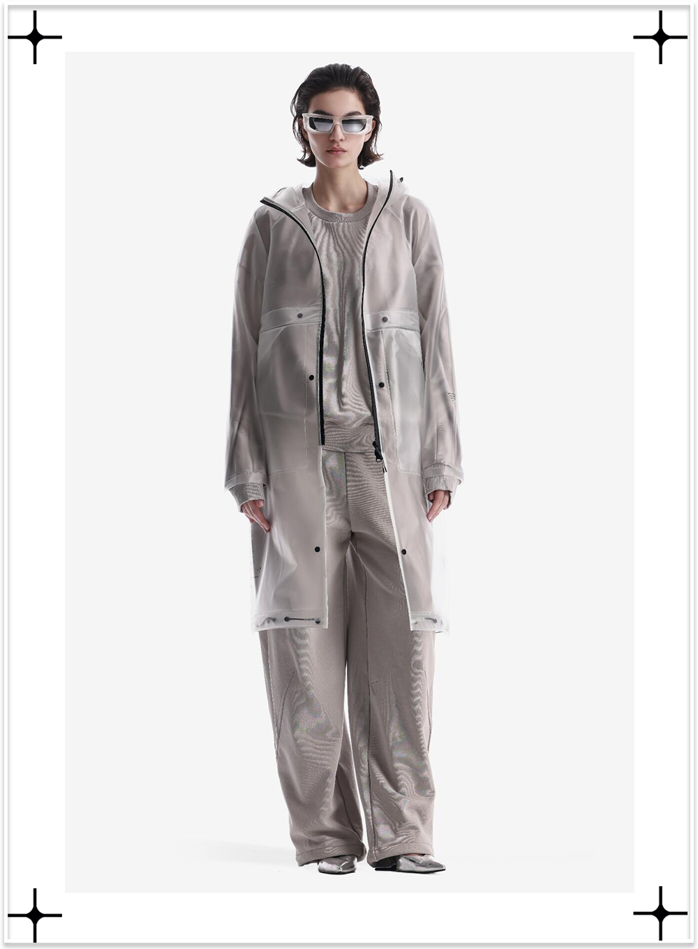 未来感并不意味着密不透风,透明或半透明的科技感材质,如PVC、TPU或改良的轻透网纱,被大量运用。