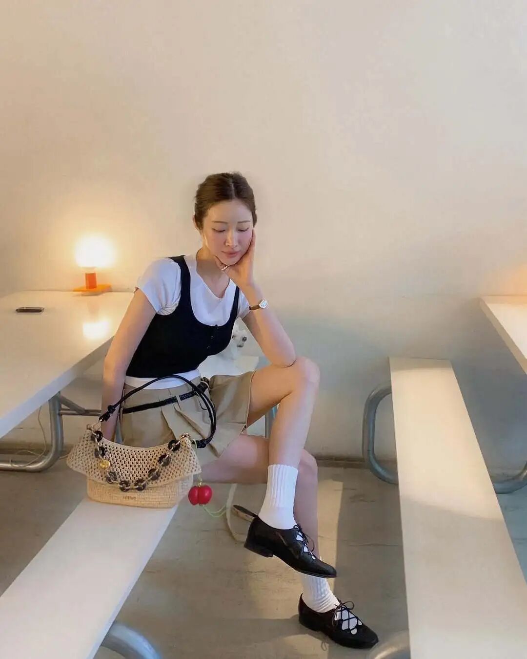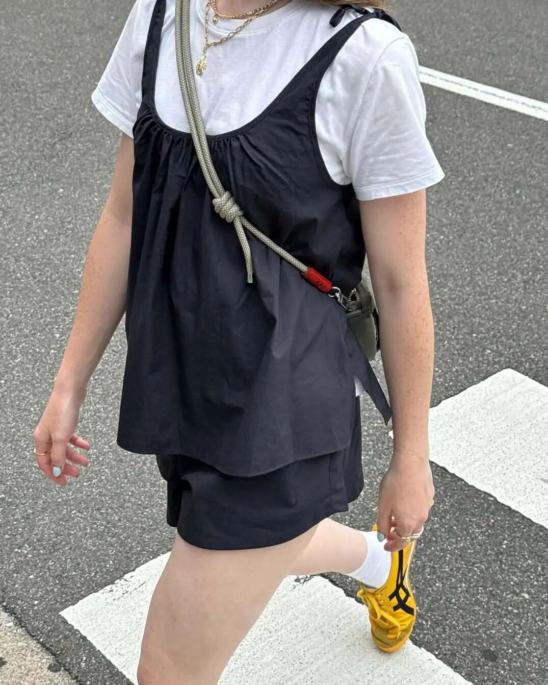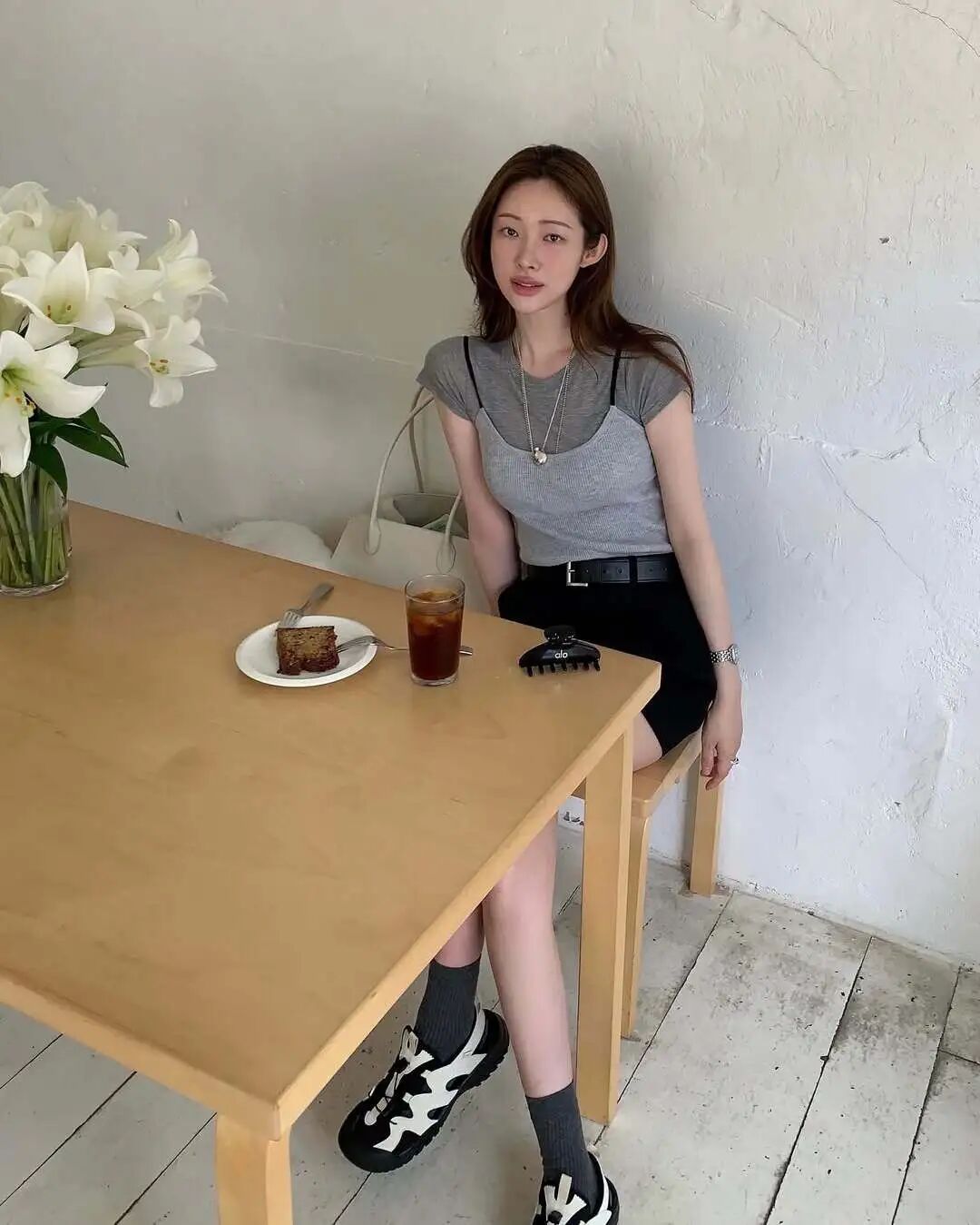 这几年韩女们常常上身的T恤叠穿,是在纯色T恤外面叠加一件吊带,来增加视觉的层次感。颜色上既可以与外层T恤形成对比,也可以选择同色系的深浅搭配。