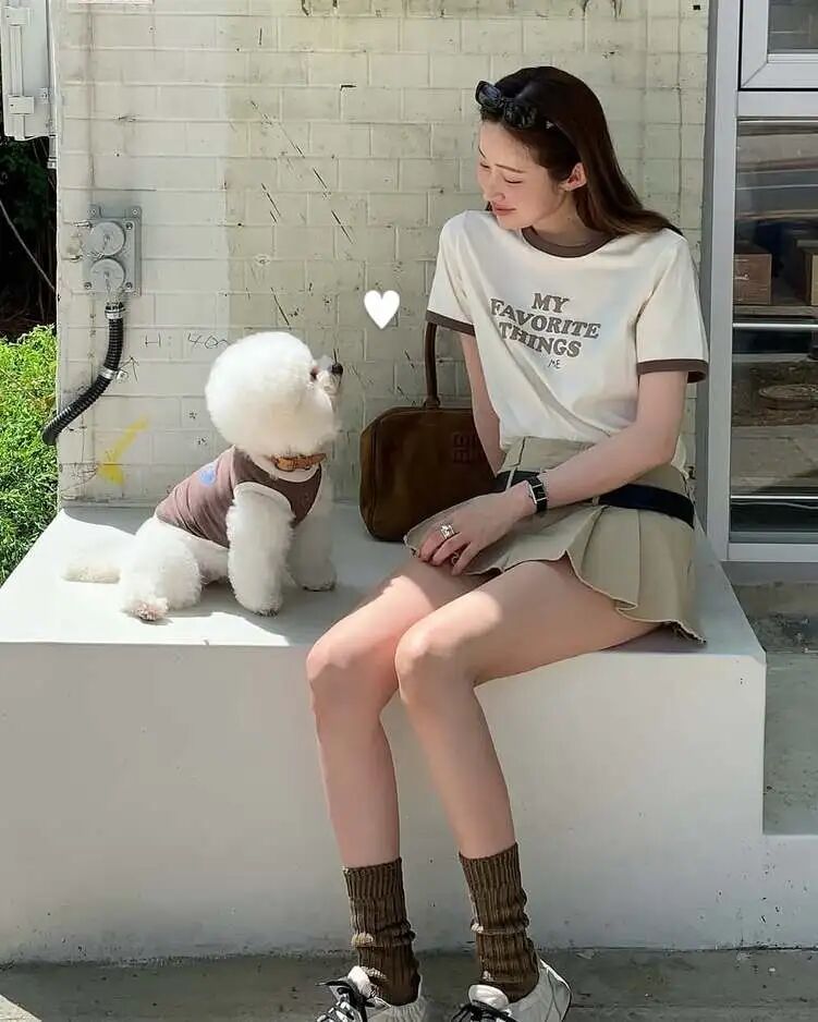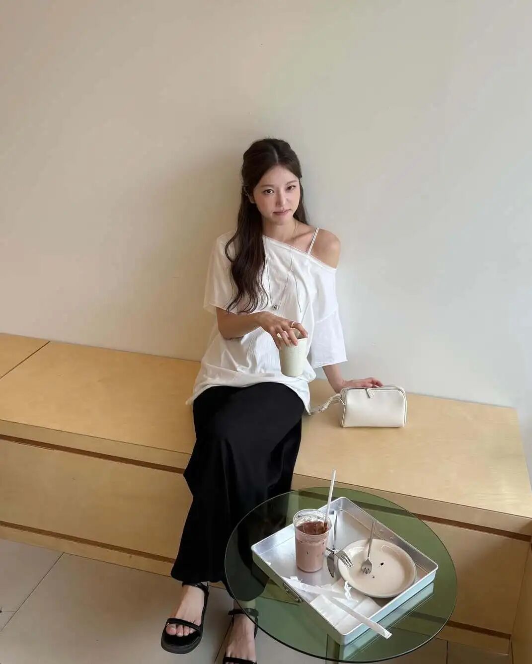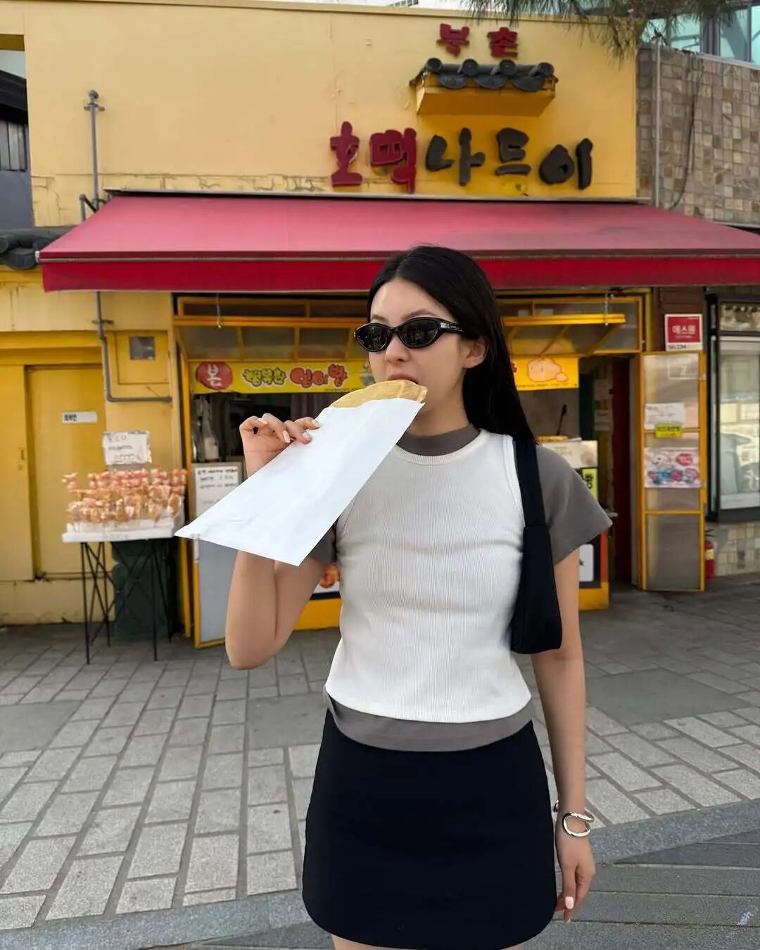 这几年韩女们常常上身的T恤叠穿,是在纯色T恤外面叠加一件吊带,来增加视觉的层次感。颜色上既可以与外层T恤形成对比,也可以选择同色系的深浅搭配。