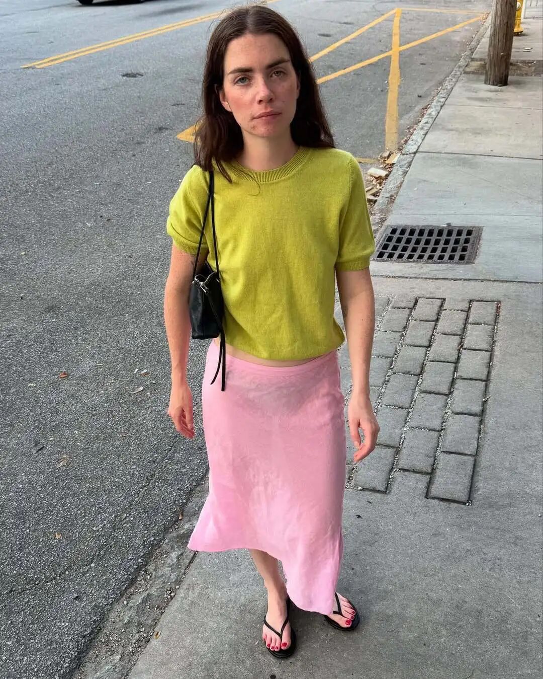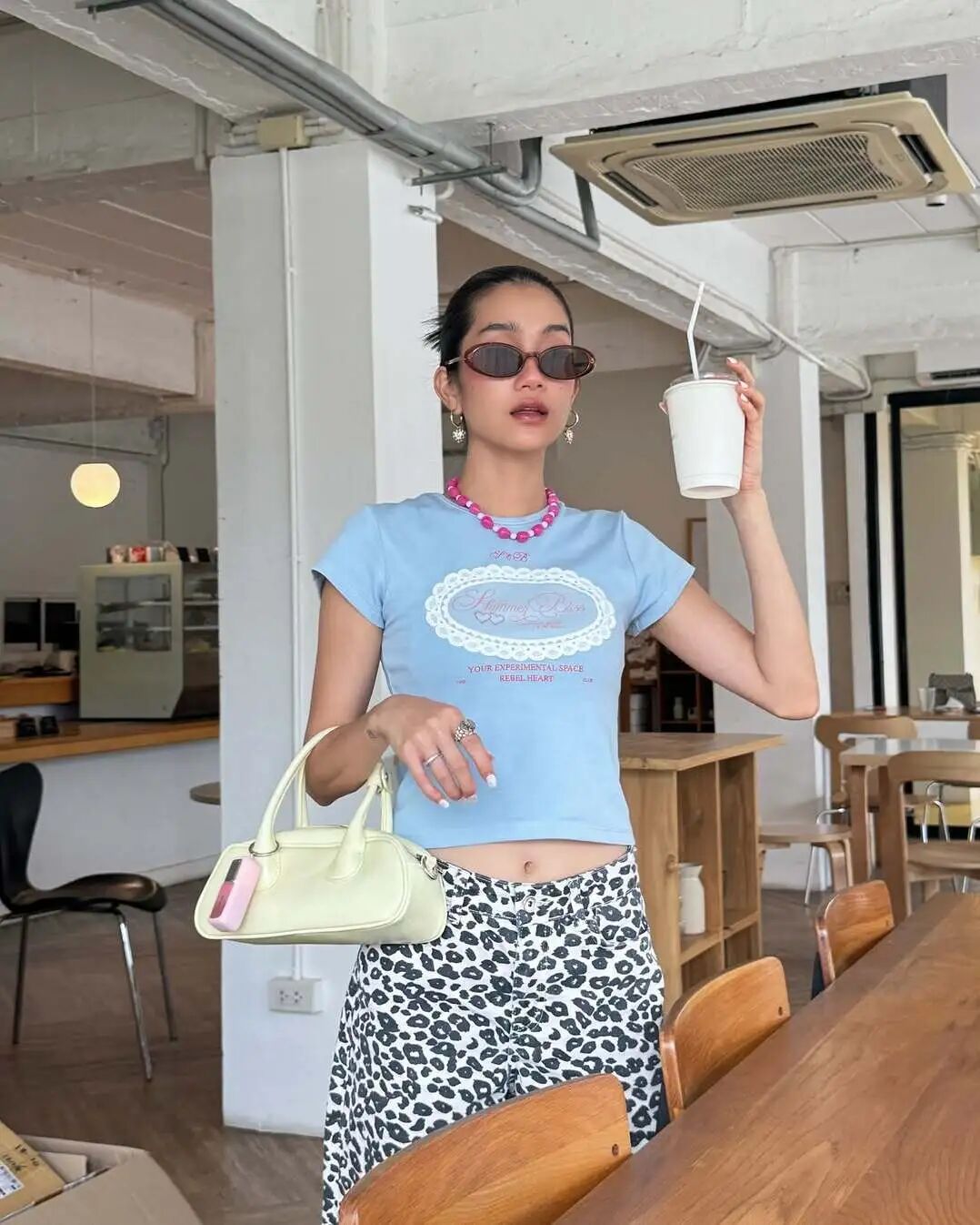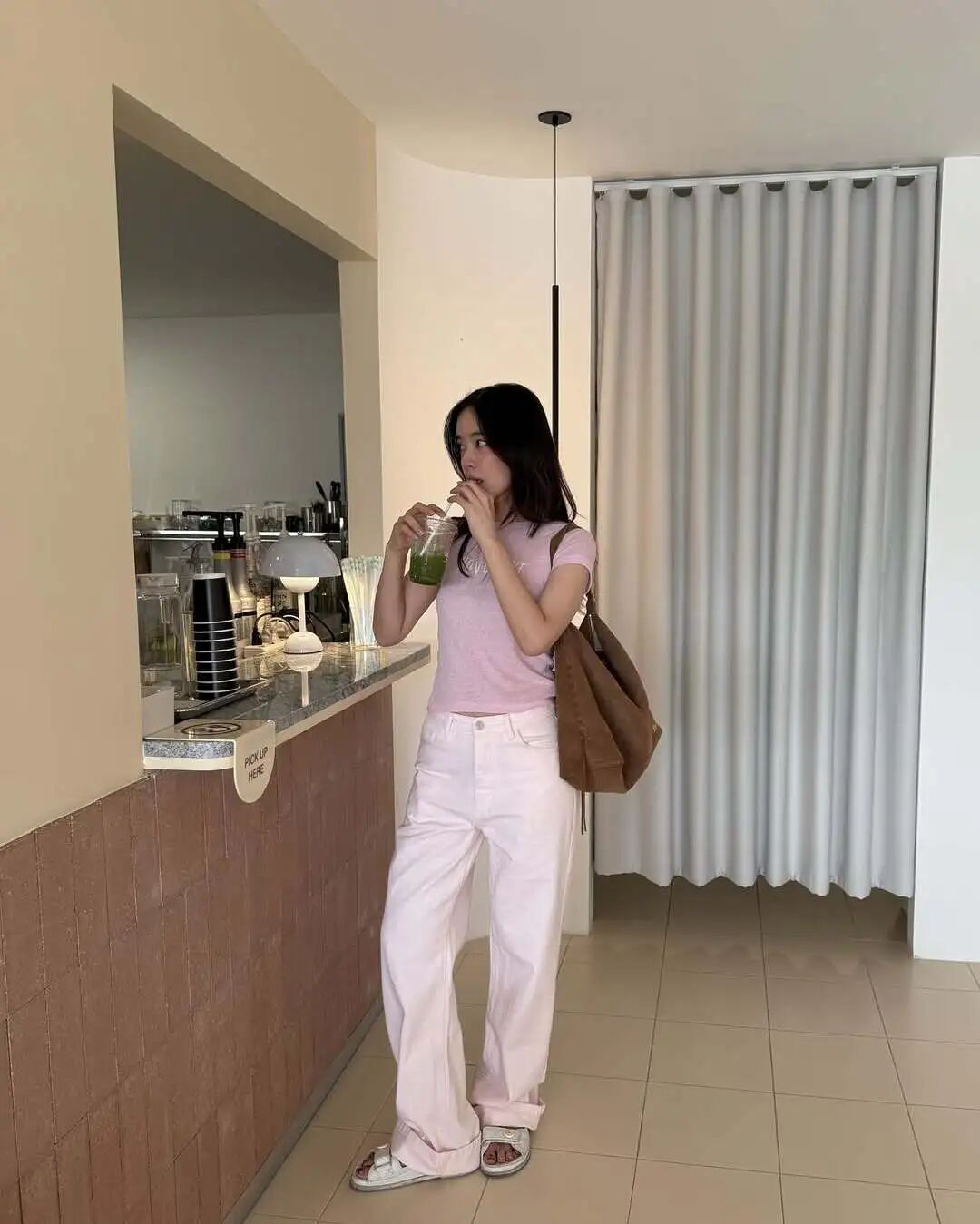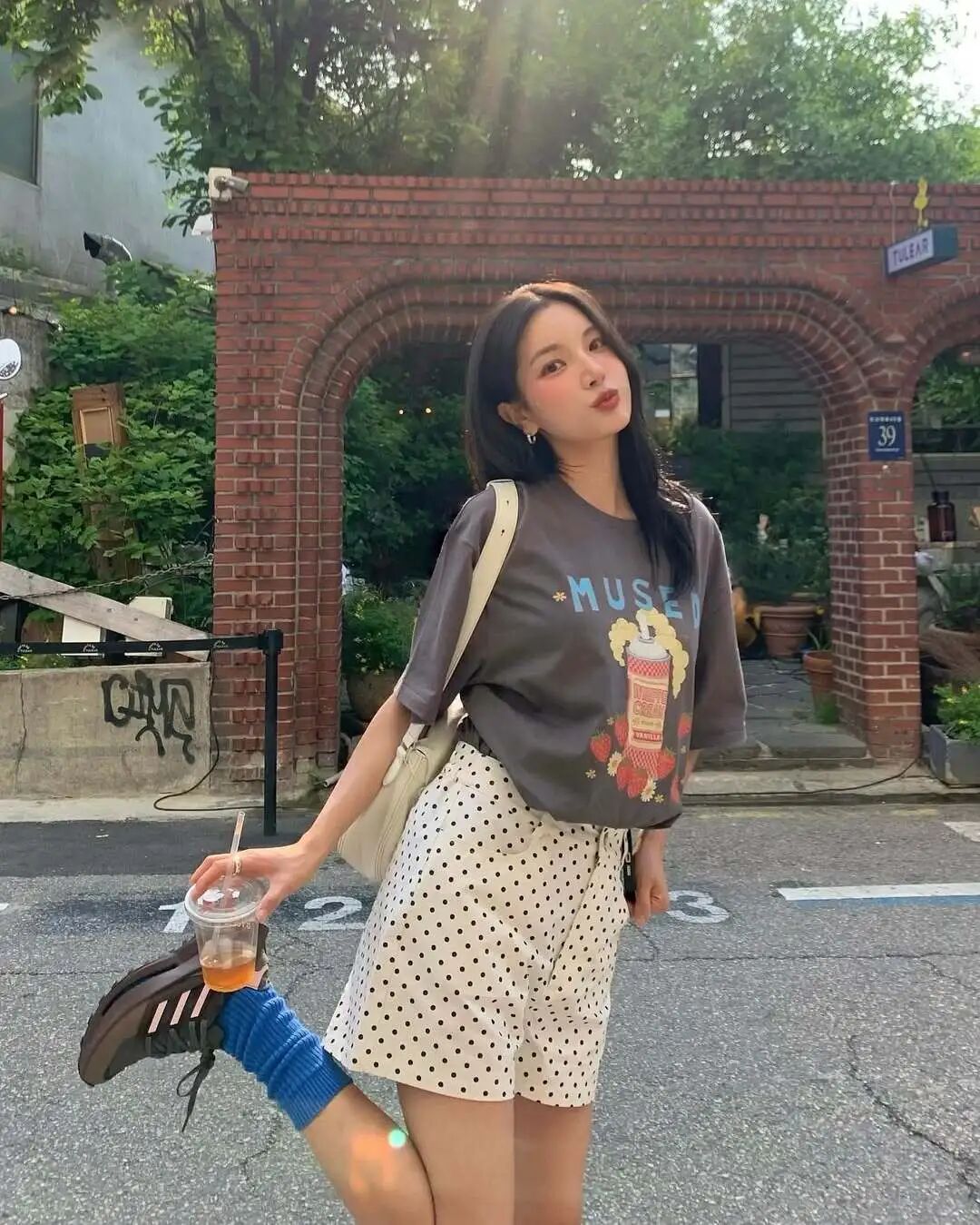 对于想要有点“突破”的时装玩家,可以尝试将亮色T恤与同色系但不同饱和度的单品相配。比如,一件很夏日风的牛油果绿色T恤,可以搭配粉色半身裙,焕发出蓬勃生命力。或是同色系的渐变搭配,创造出层次丰富的视觉效果,既统一又富有变化。