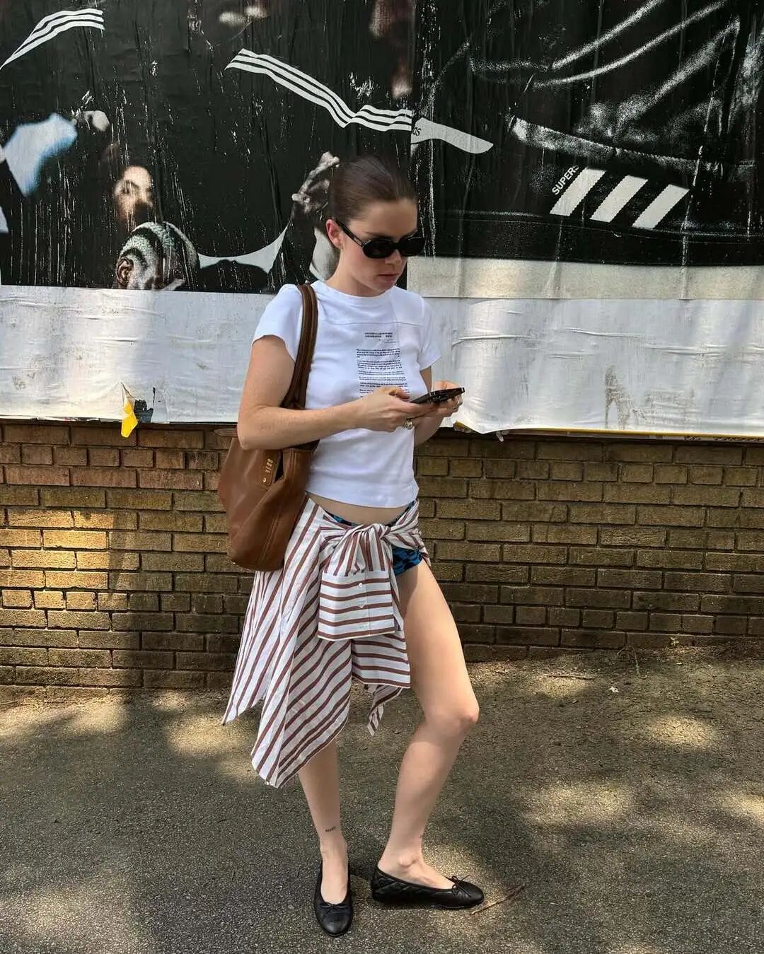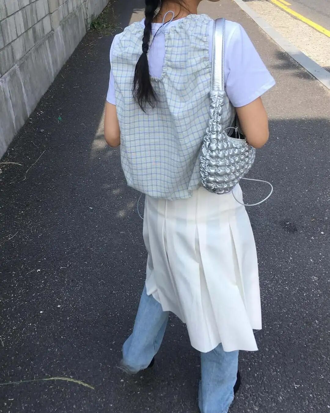 升级一下,还可以将背心穿在T恤外面,巧妙构建了上衣的视觉纵深。如果天气太过炎热,可以选择薄纱质地的单品叠加,朦胧的通透感刚好给上衣增加一层柔光滤镜。
