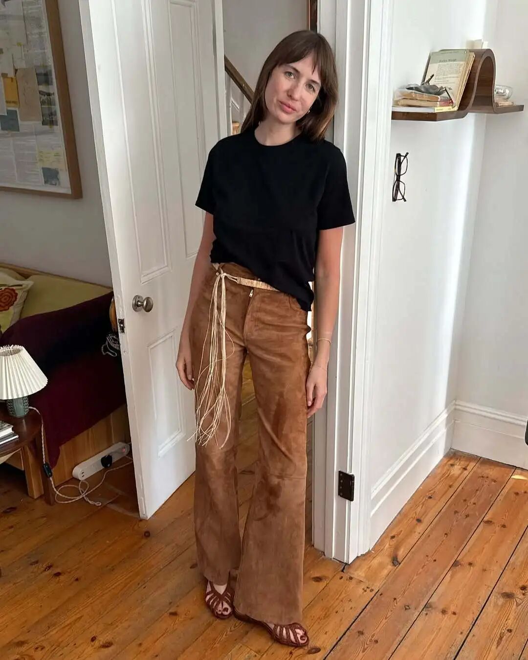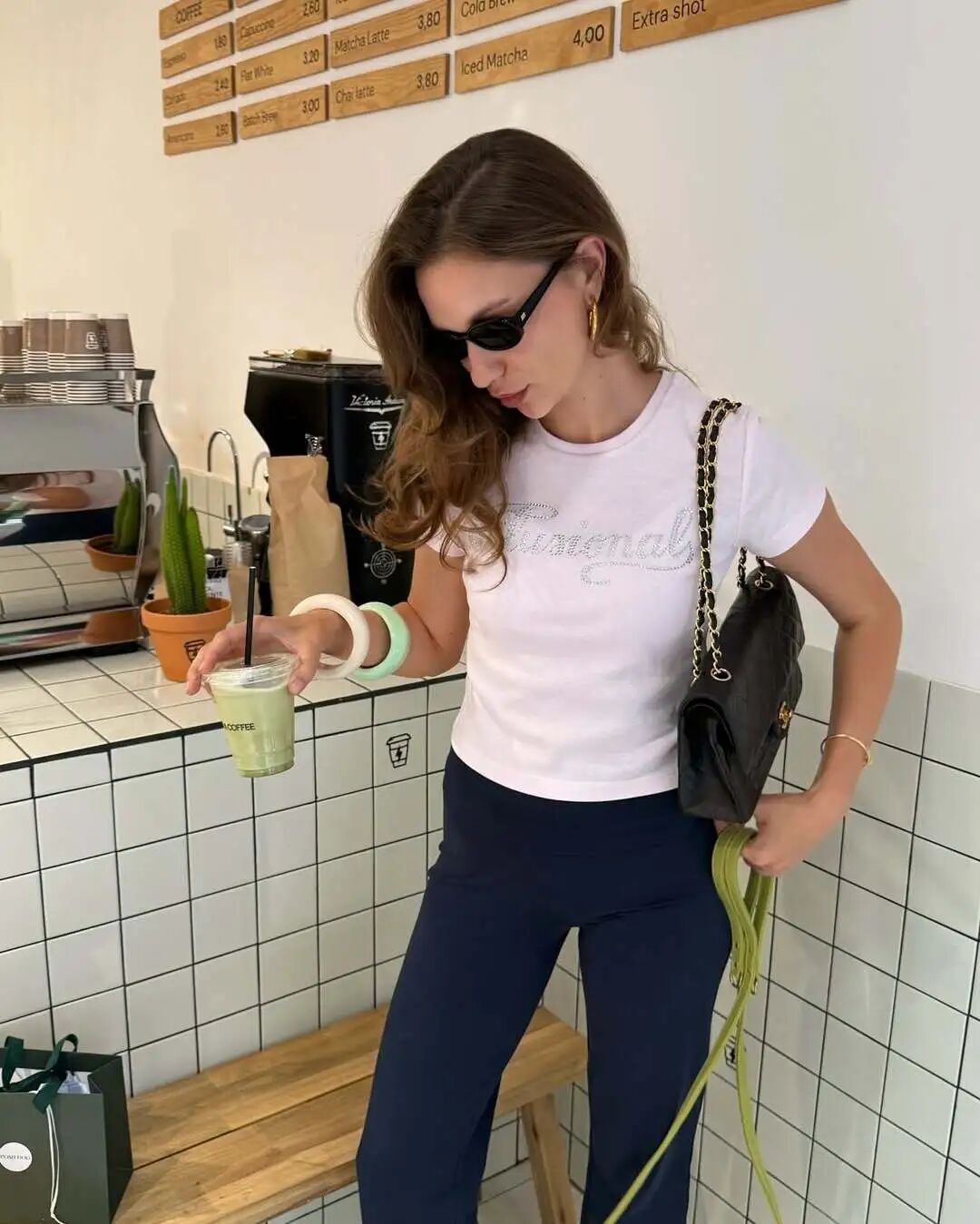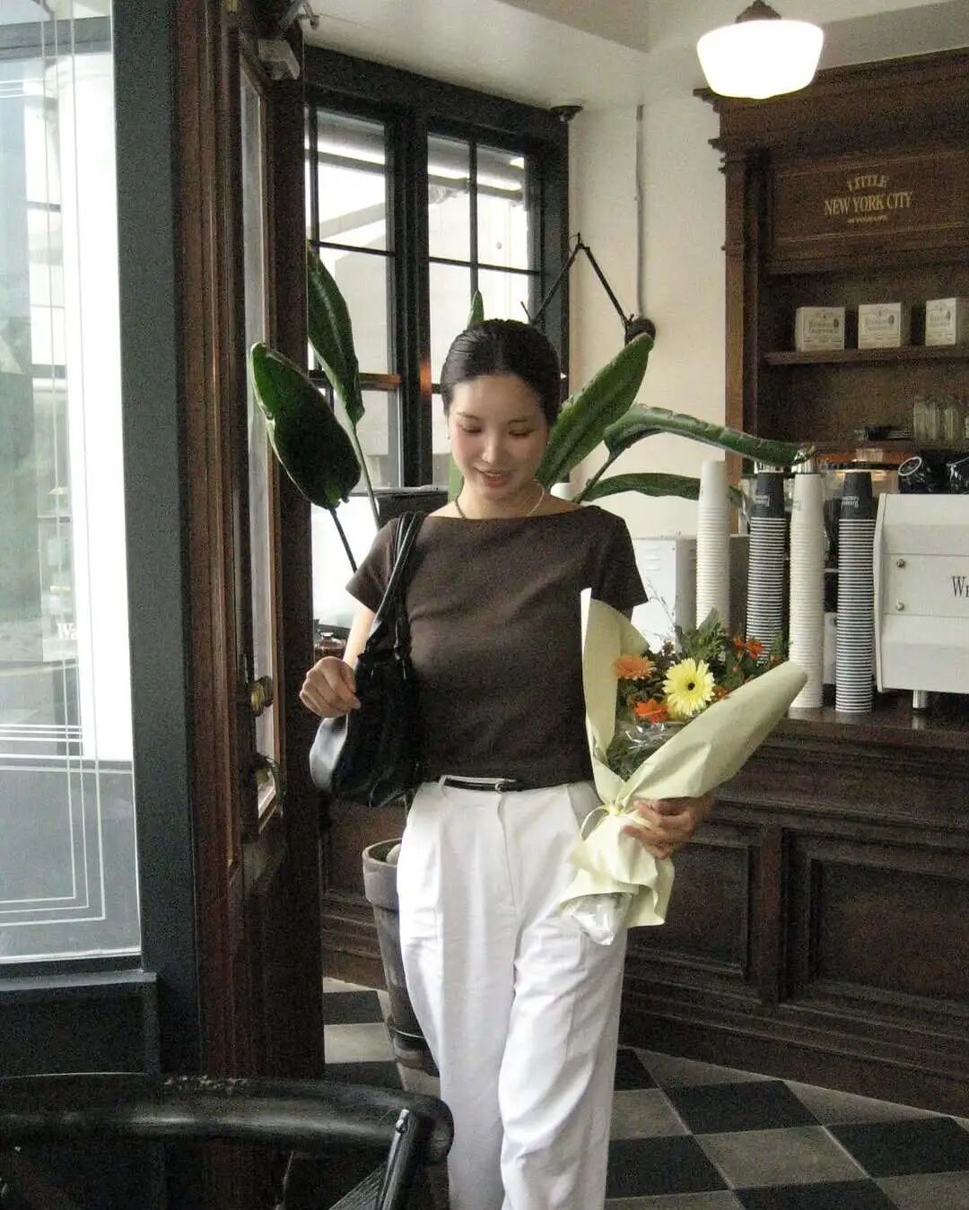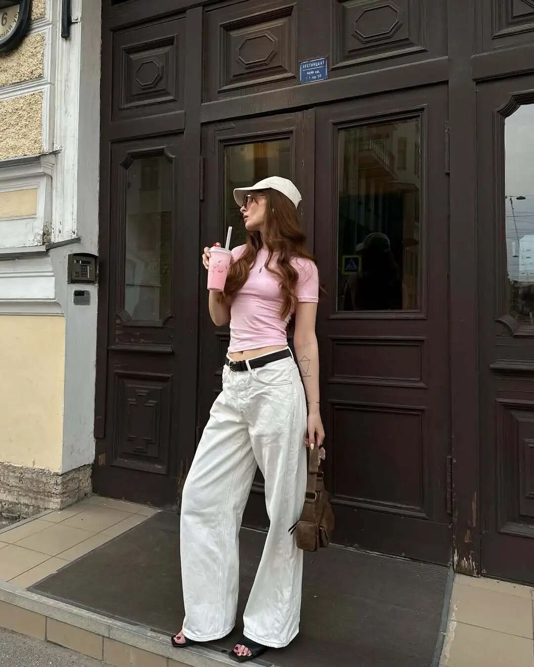 和阔腿裤放在一起,看似矛盾的组合却能创造出一种独特的视觉张力。上身的贴合与下身的宽松形成对比,既展现了女性的曲线美,又不失洒脱的气质。