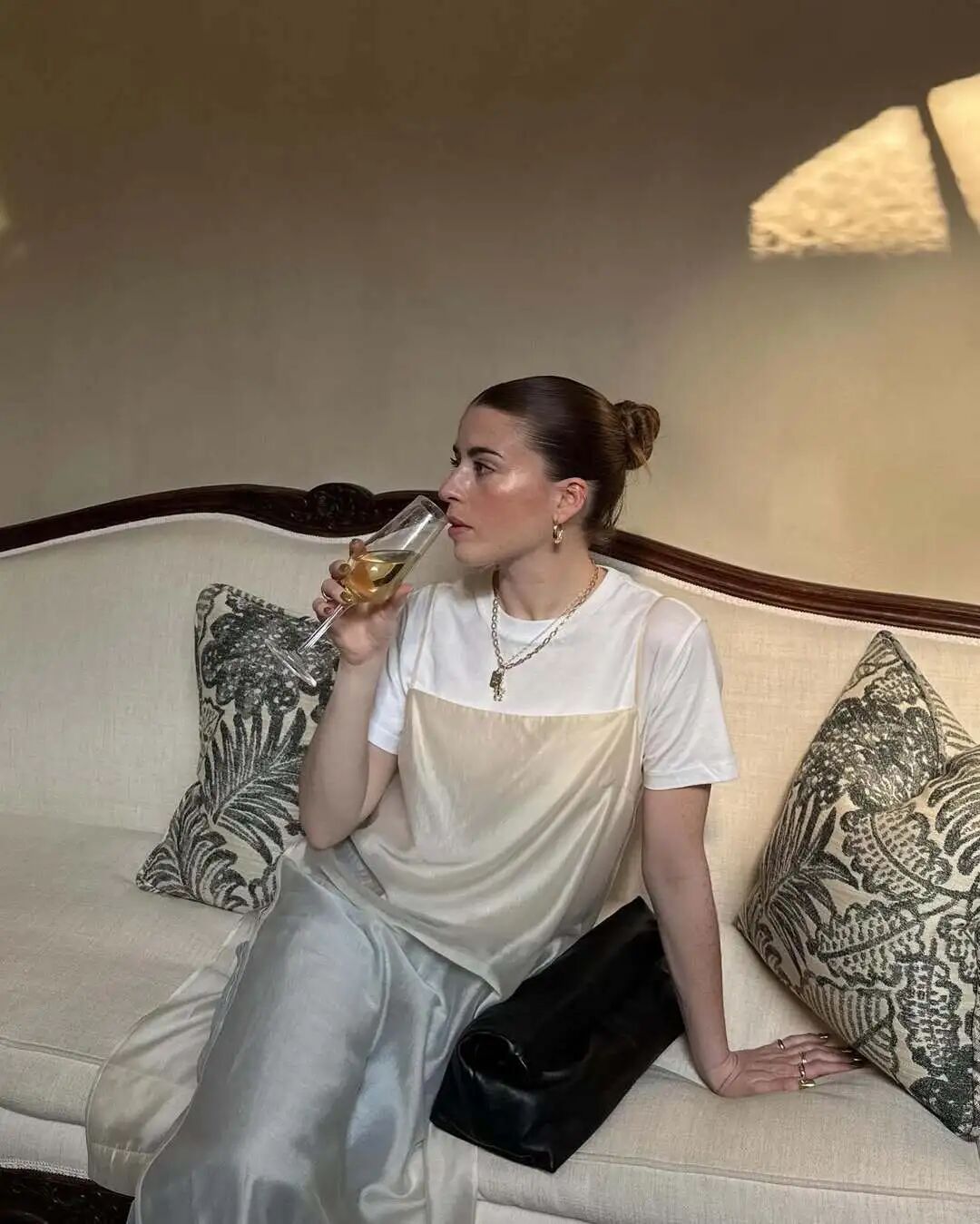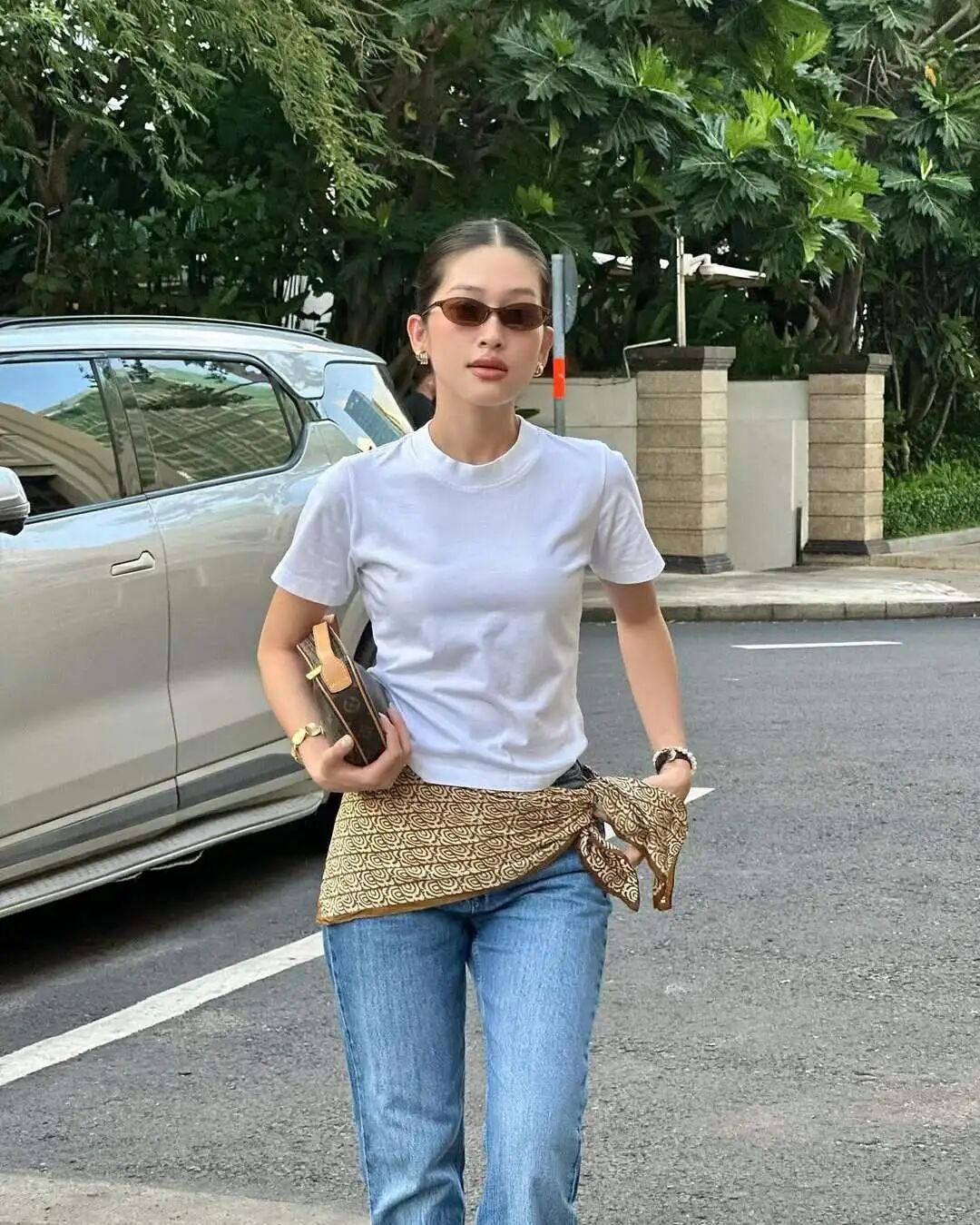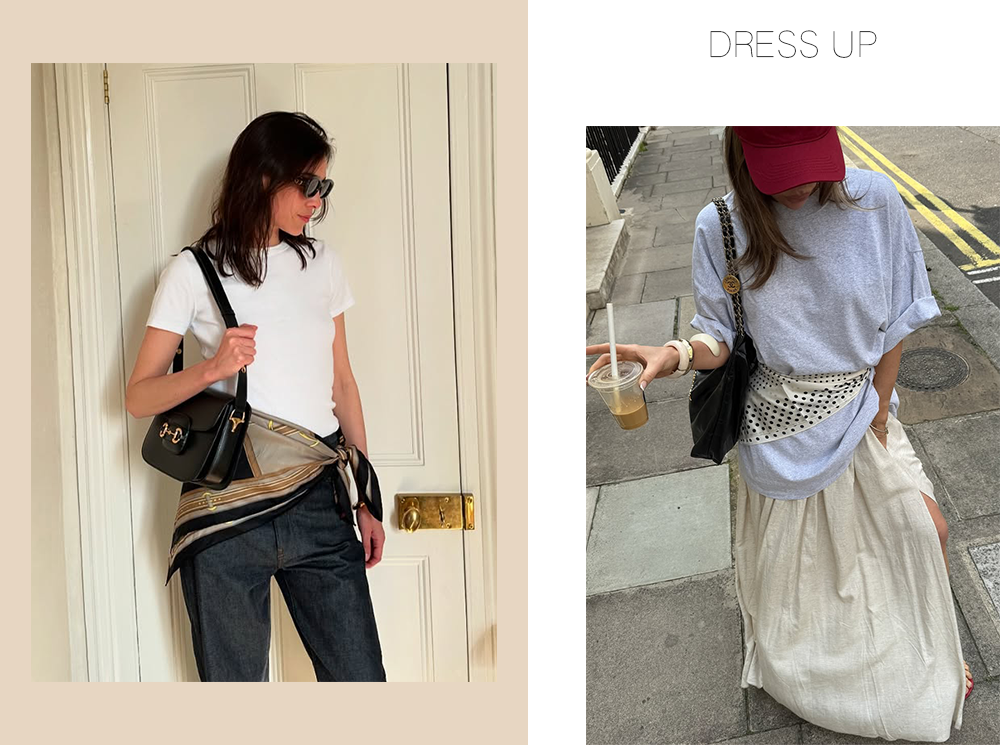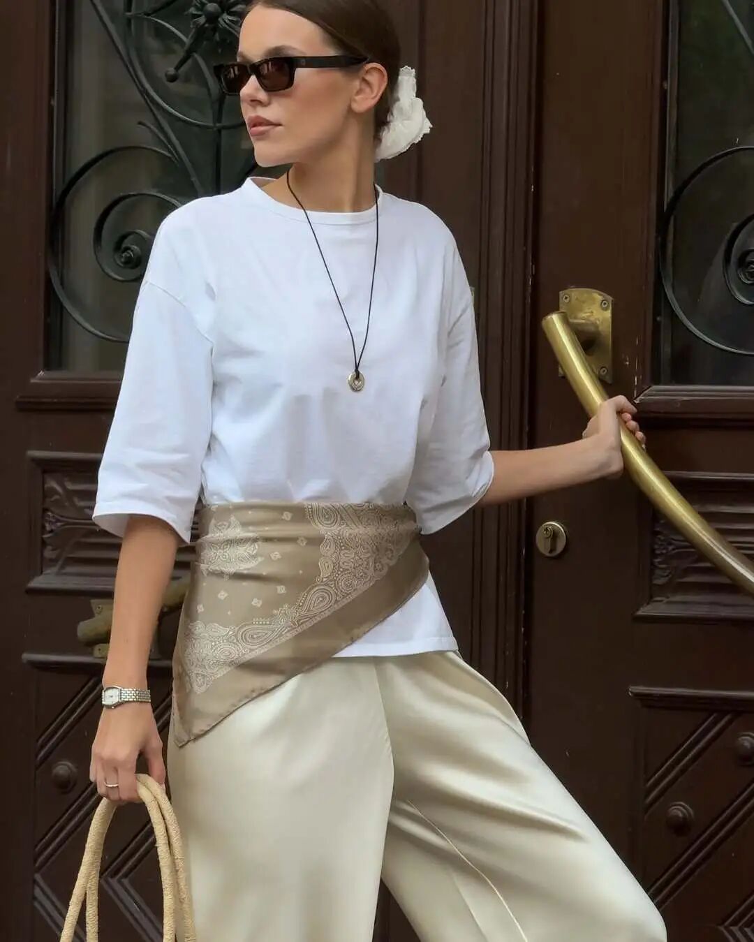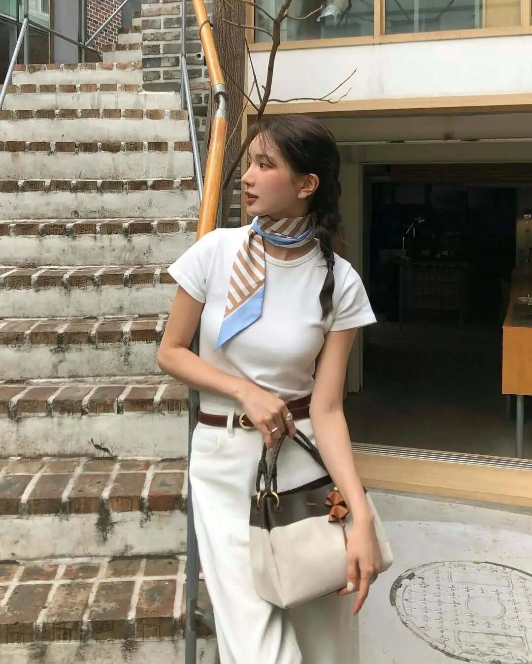 最近开始“走红”的一种叠穿方式,是将丝巾斜系于T恤,尤其是基础款白色T恤的下摆。衣柜里的丝巾又能“再就业”,打破了原本的穿衣秩序,为“寡淡”的上衣注入优雅。