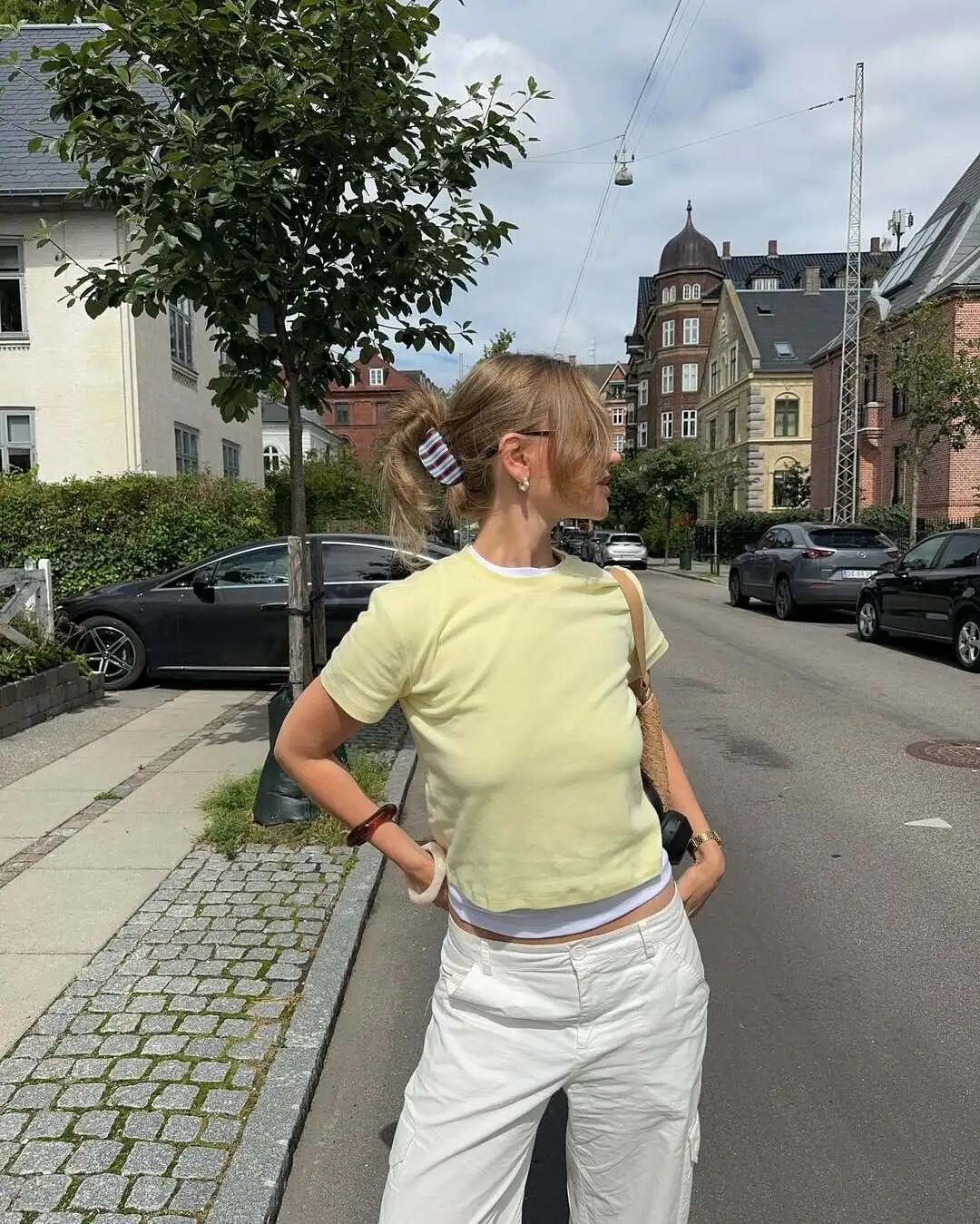 在搭配亮色时,下半身可以走简单路线,让视觉中心聚焦在T恤上,这种穿法更加适合日常,保持亮色的视觉冲击力,同时又不失女性的优雅气质。