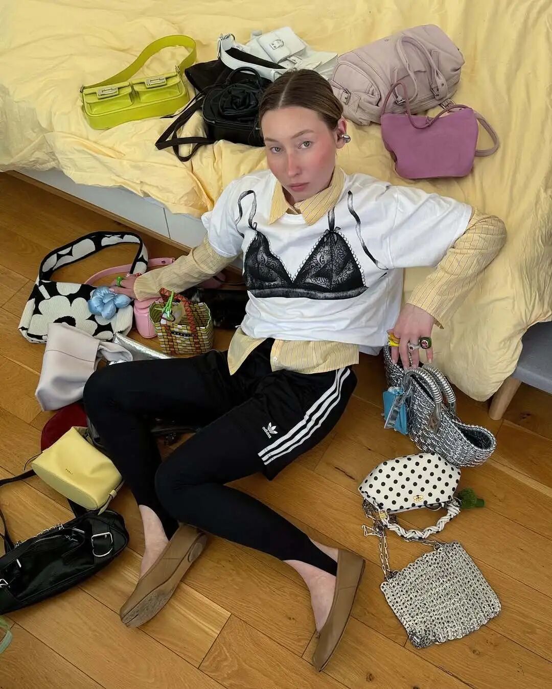 还有一些看似内衣外穿实则为印花T恤的创意穿法,一件也能穿出多件叠穿的层次感。总之,大胆发挥想象力,让衣服自己开口说话,“为你发声”。