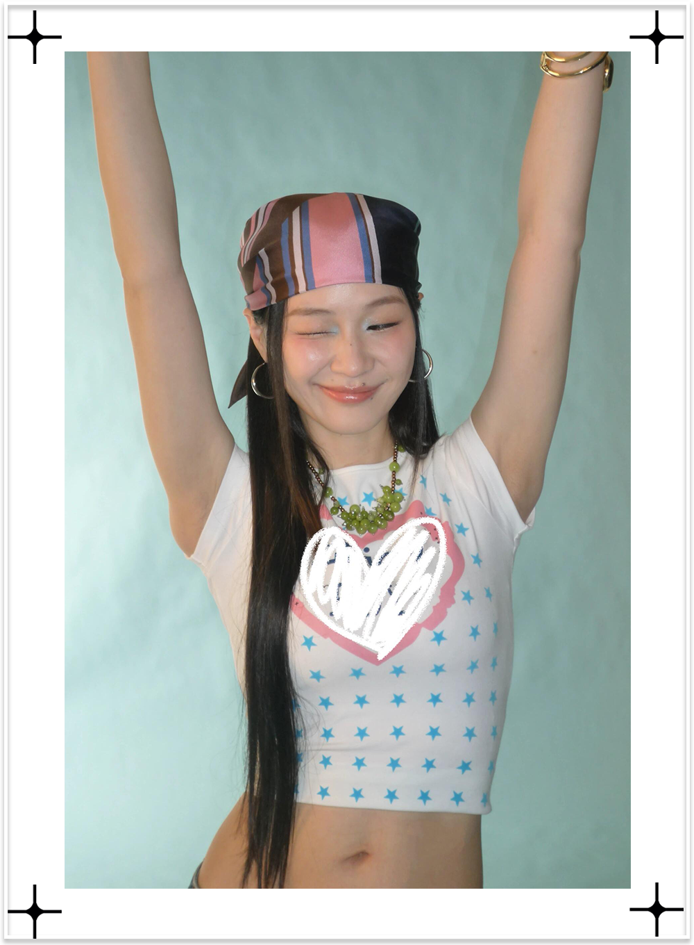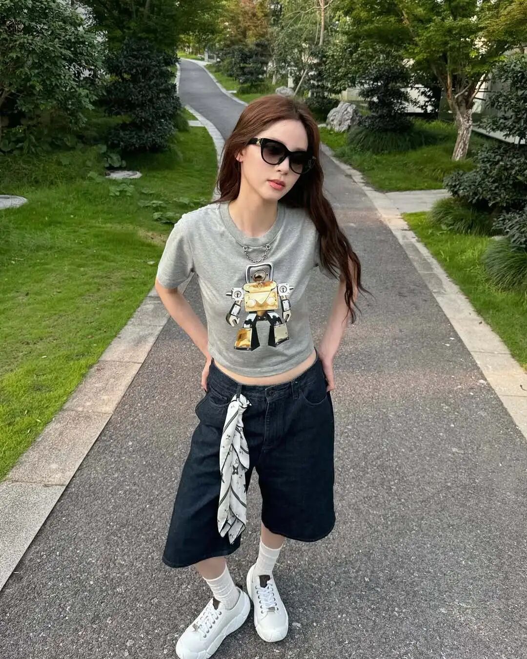 T恤想要穿得足够特别,可以在廓形上适当调整。经过了前几年越做越大的T恤风格,今年开始回归到能够勾勒身材线条的紧身短款Tee,正如金靖上身的这种,自带当下流行的千禧风格。