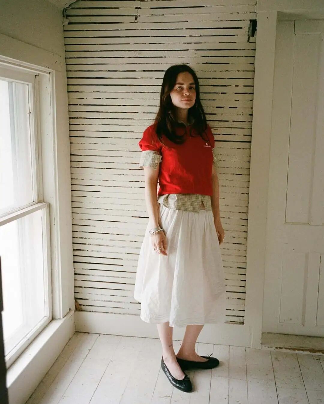 想要get像金靖“千禧感”的穿搭,下装可以重点选择“低腰”,不管是半身裙还是喇叭裤,低腰的设计可以让千禧感更加强烈。