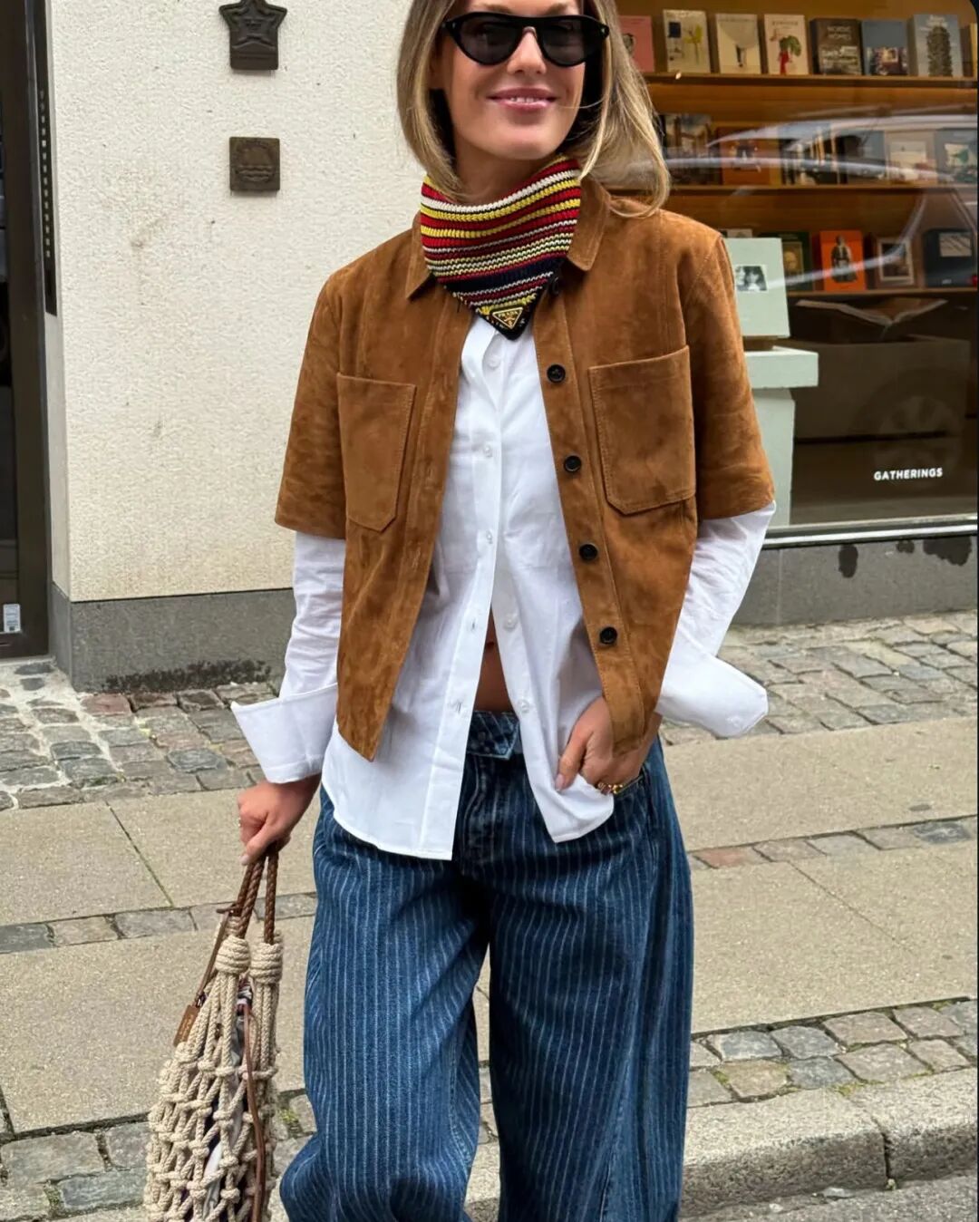 麂皮自带暖绒感,是糖炒栗子风的灵魂材质之一,一件麂皮上衣不仅能够抵御渐凉的秋风,更能保护住“脆皮打工人”被空调病侵袭。哪怕在简单的T恤牛仔裤上叠穿,就足够时髦。