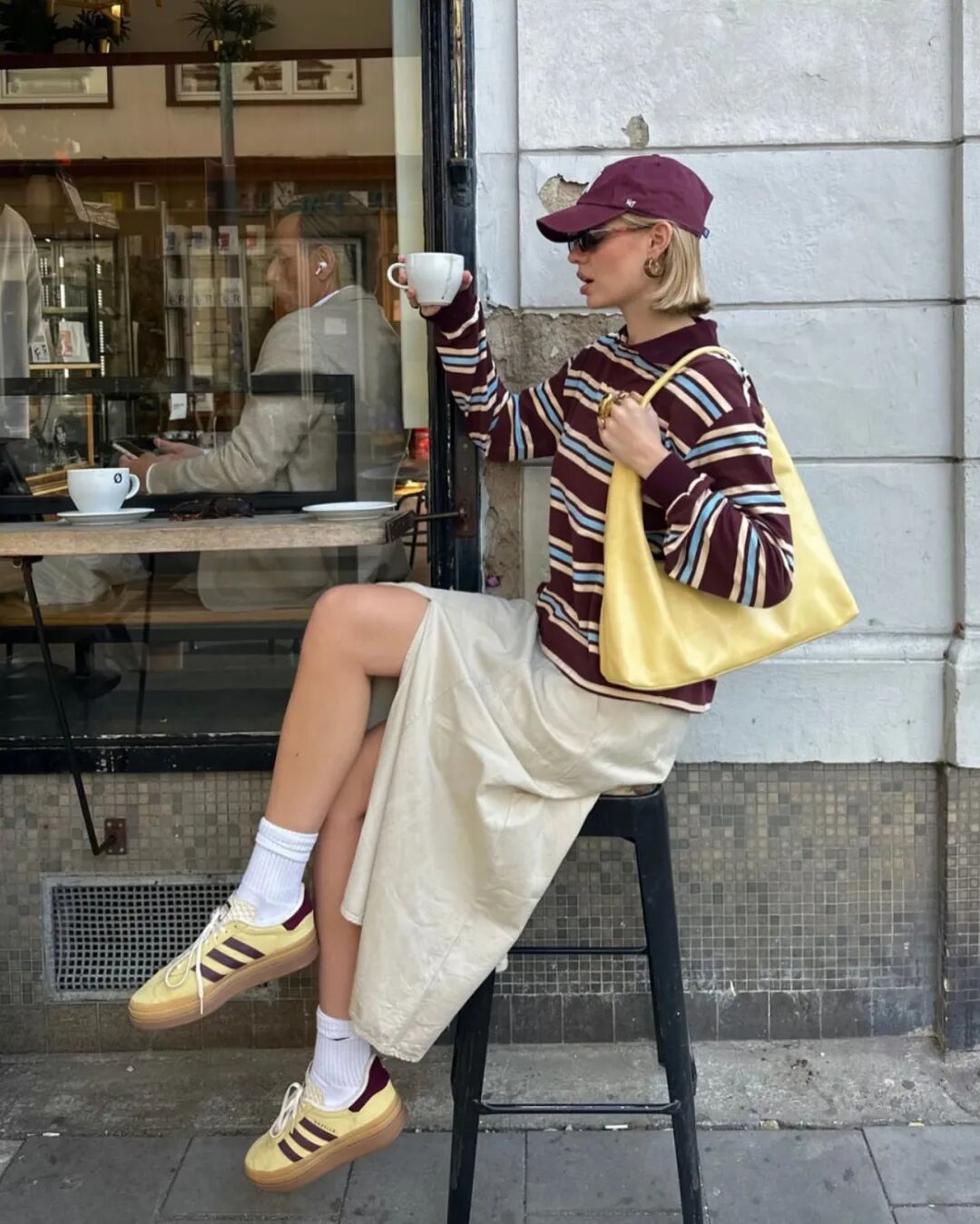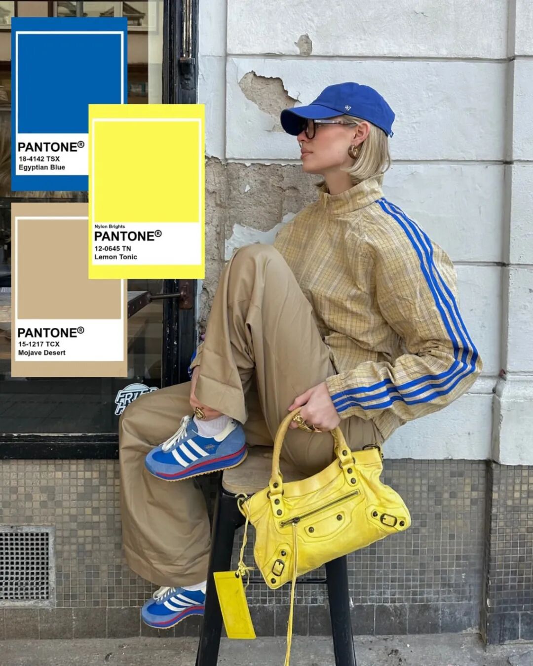 打破单调,增加亮点,不如试试加一件橘色半裙,或一只亮黄色包包,就连三条杠的颜色也能与鞋子呼应,打造层次丰富、视觉统一的高级感。仿佛随随便便一穿,就很好看。