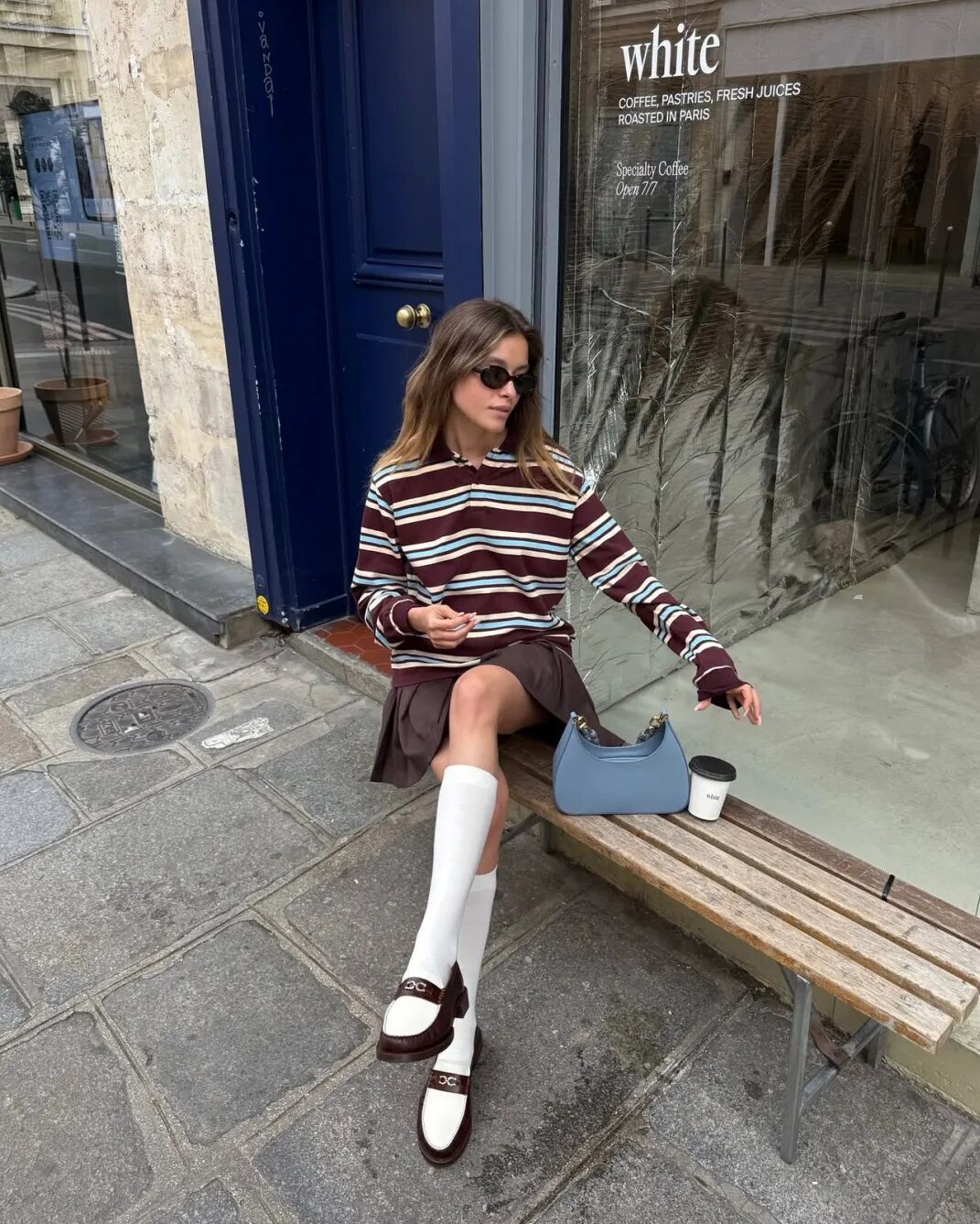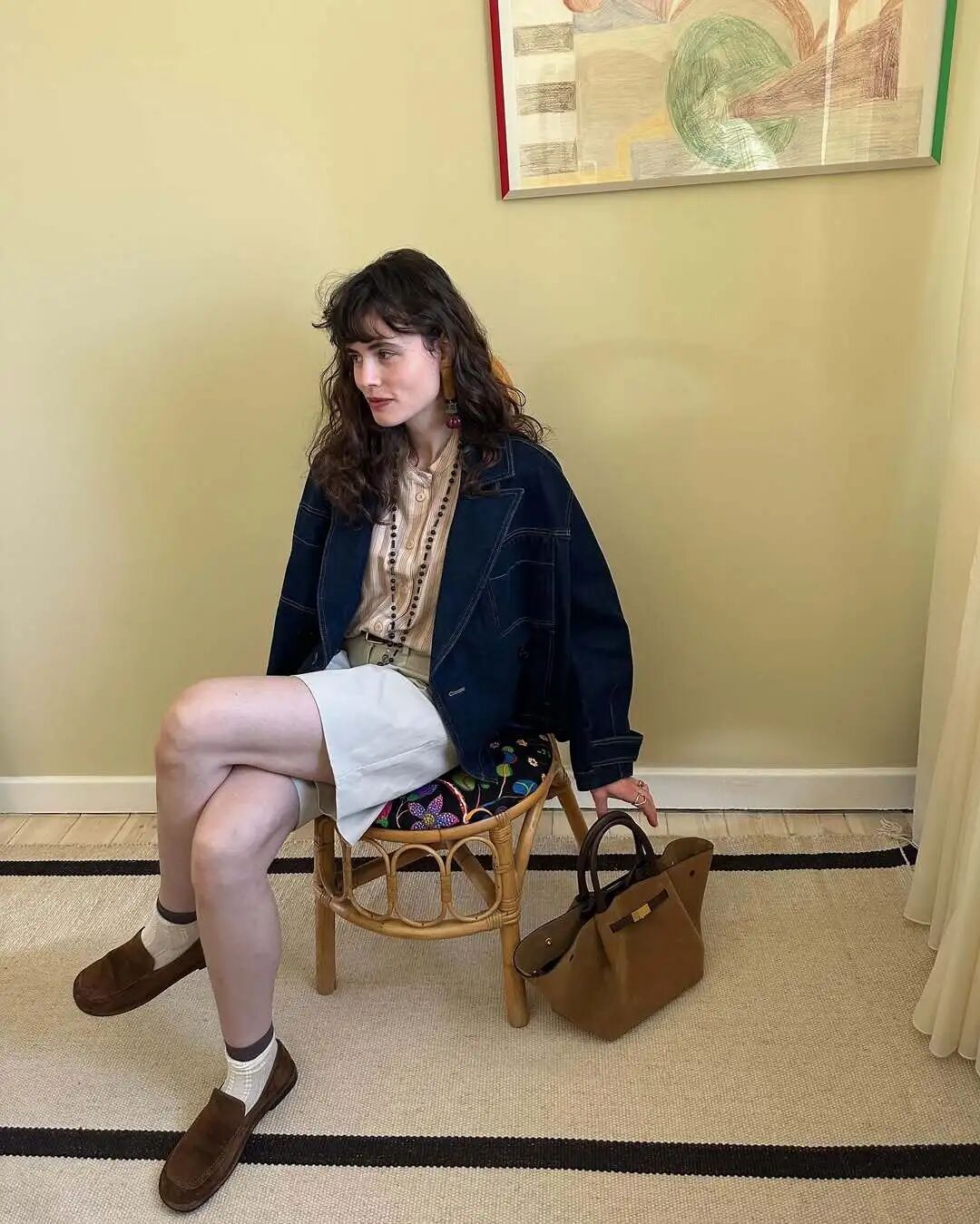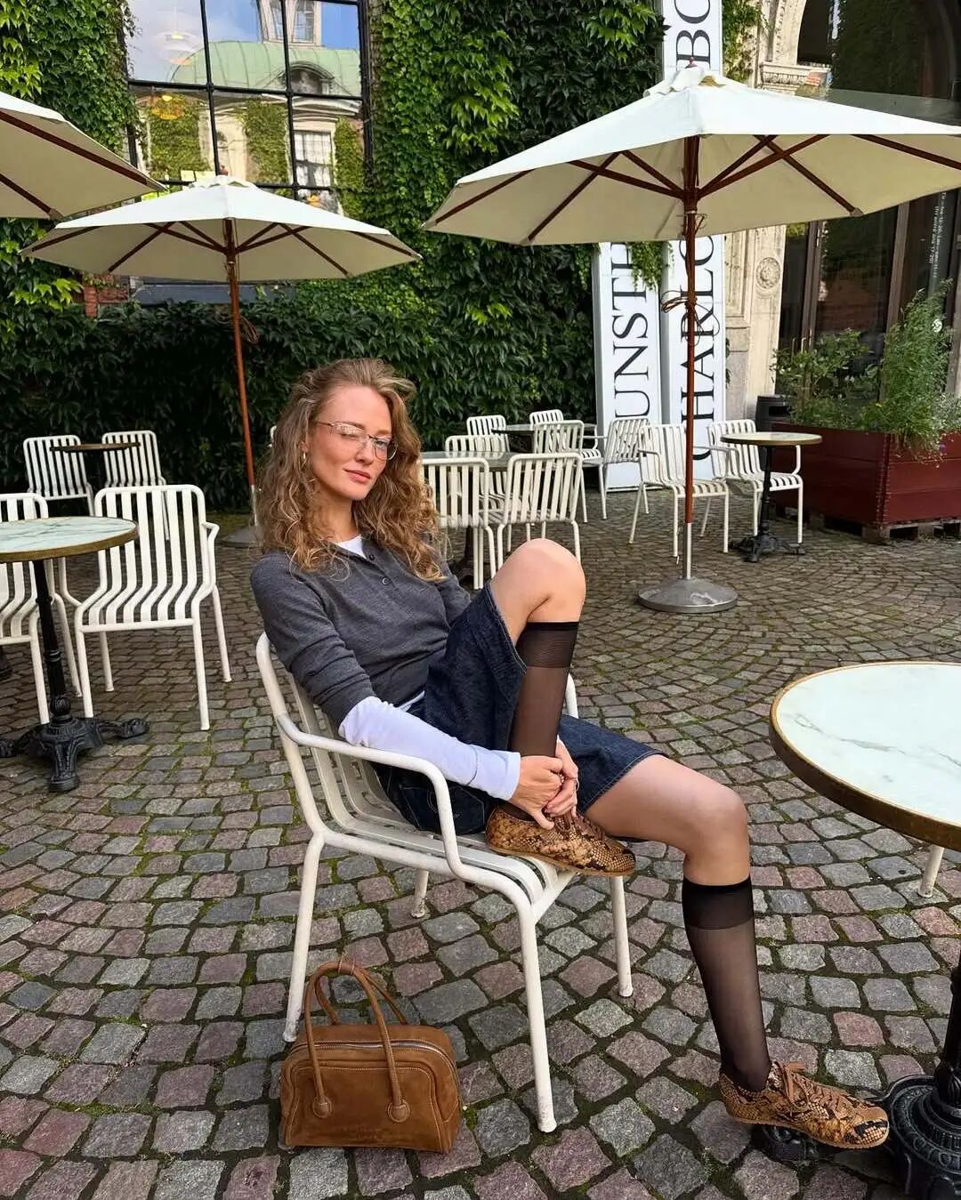 不要小看长袜,层次感全靠它。既为秋日的短裙增加温度,又能作为过渡色中和看似有些一本正经的棕色,特别是搭配秋天必备的西装,或是质感略带沉重的麂皮、毛呢裙,把氛围一下拉回到校园,变身活力女大。