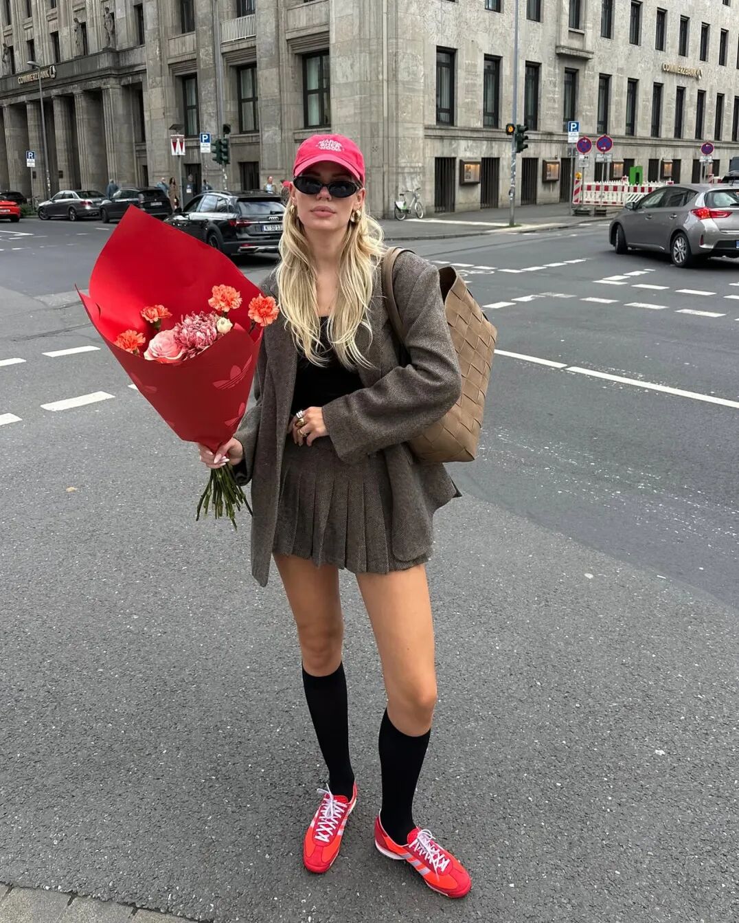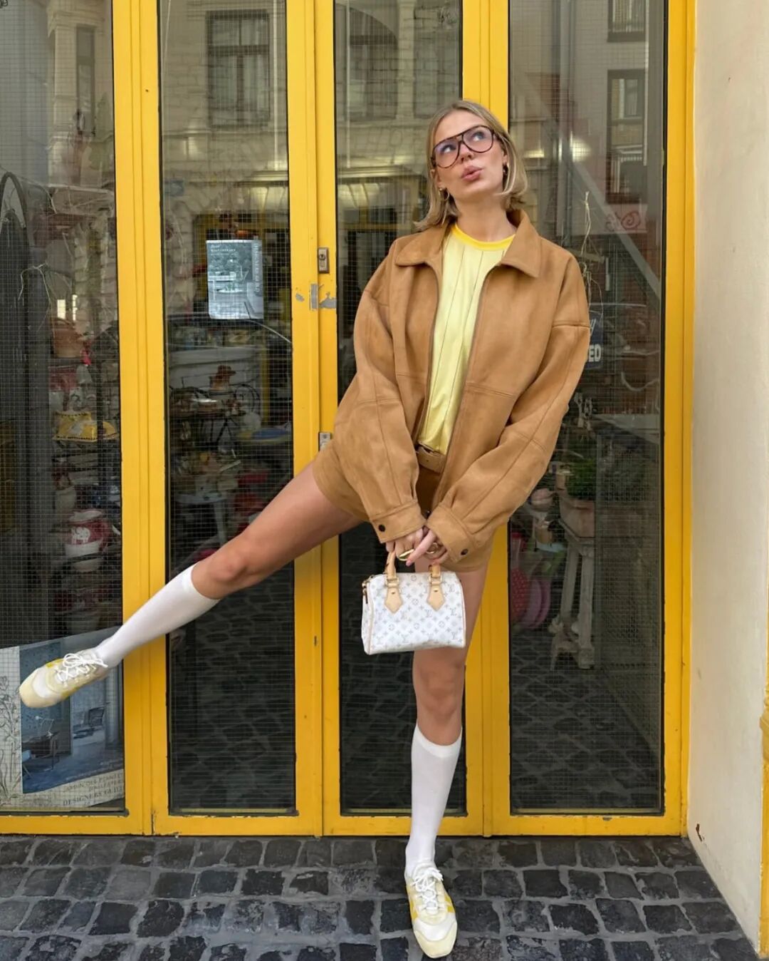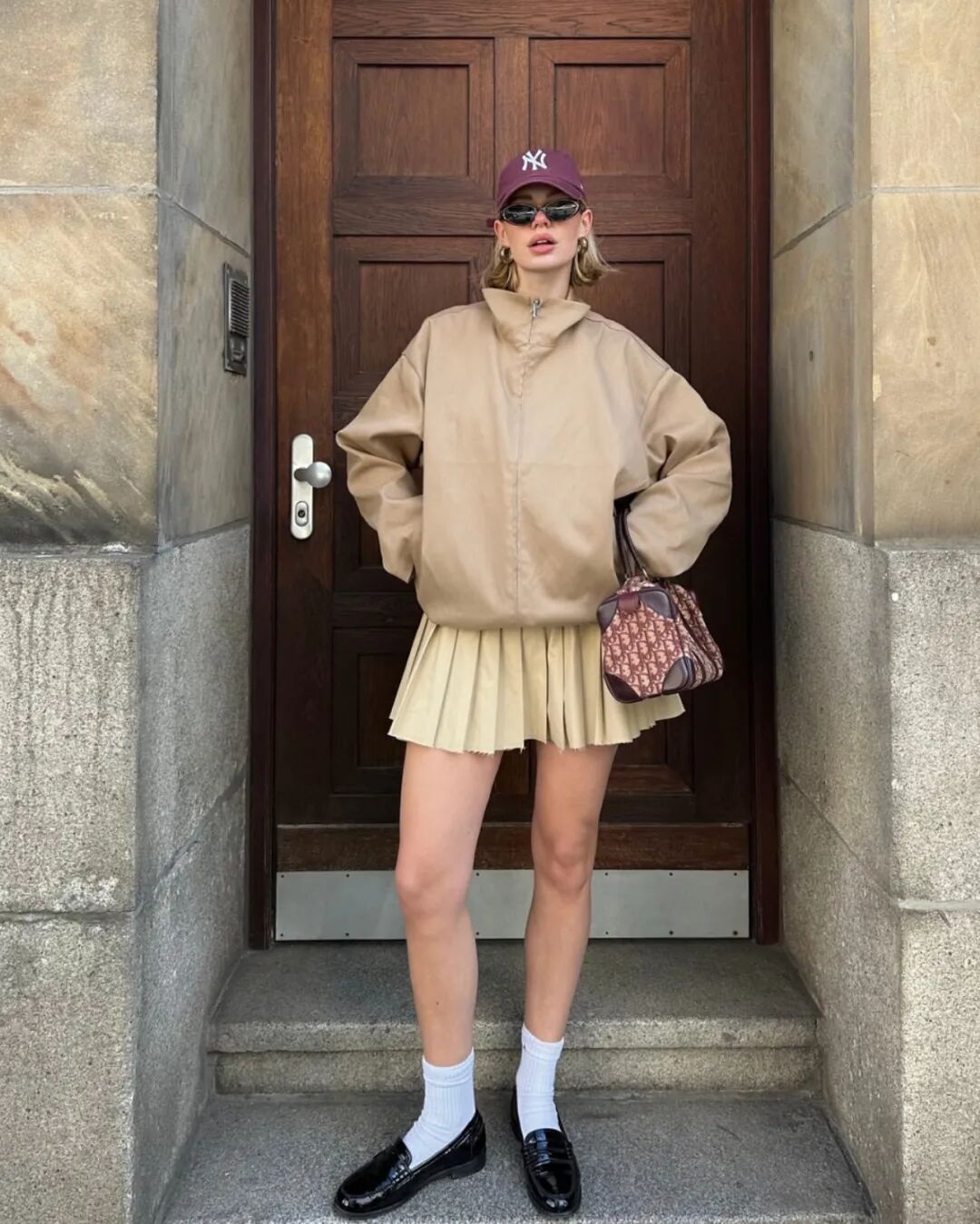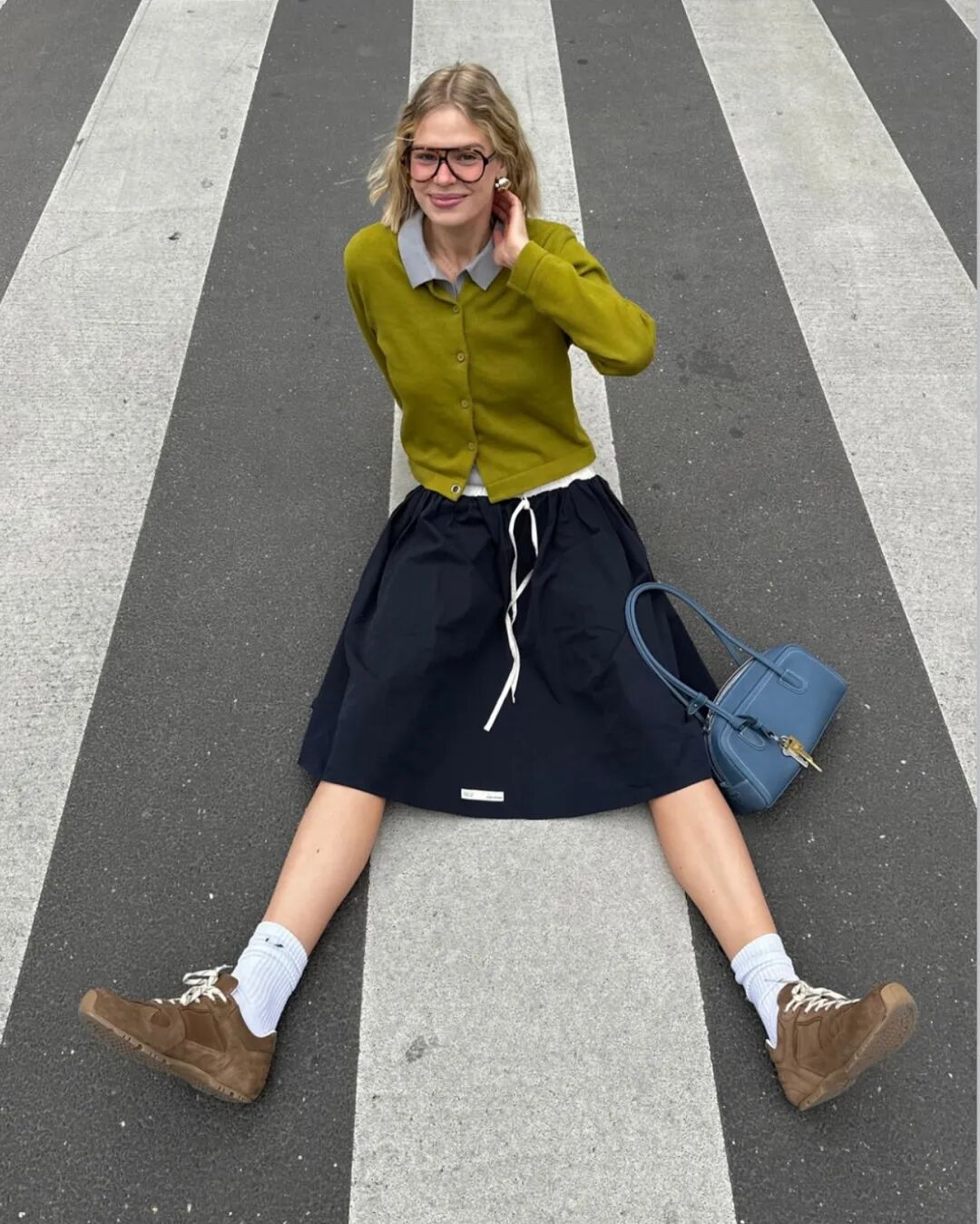 不要小看长袜,层次感全靠它。既为秋日的短裙增加温度,又能作为过渡色中和看似有些一本正经的棕色,特别是搭配秋天必备的西装,或是质感略带沉重的麂皮、毛呢裙,把氛围一下拉回到校园,变身活力女大。