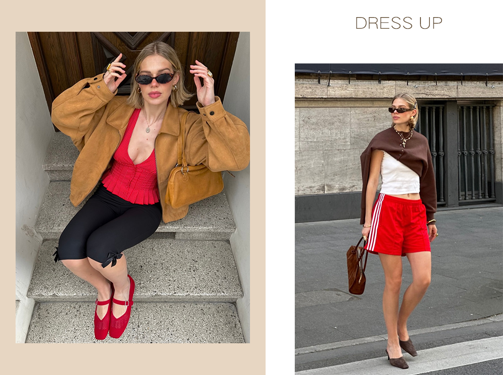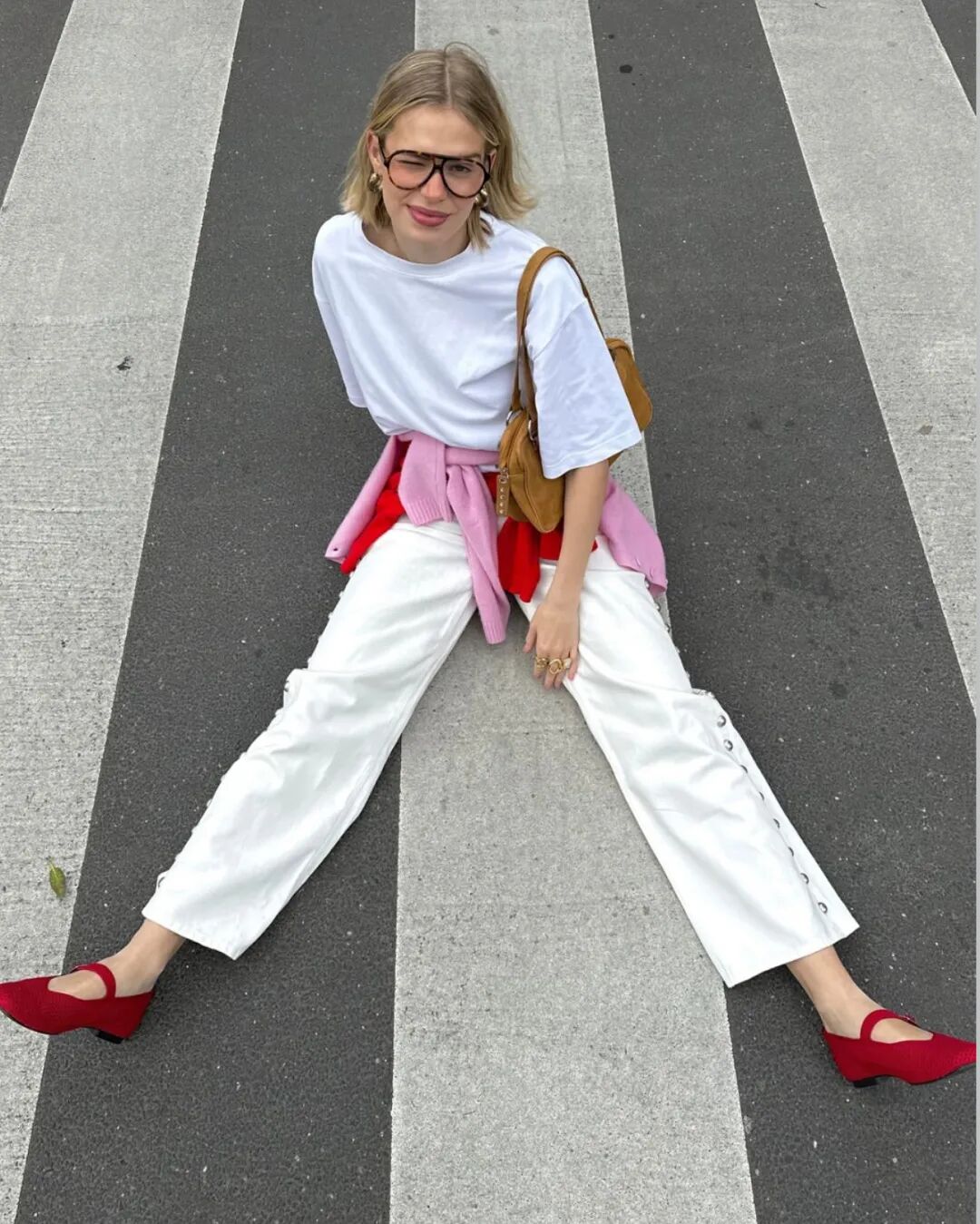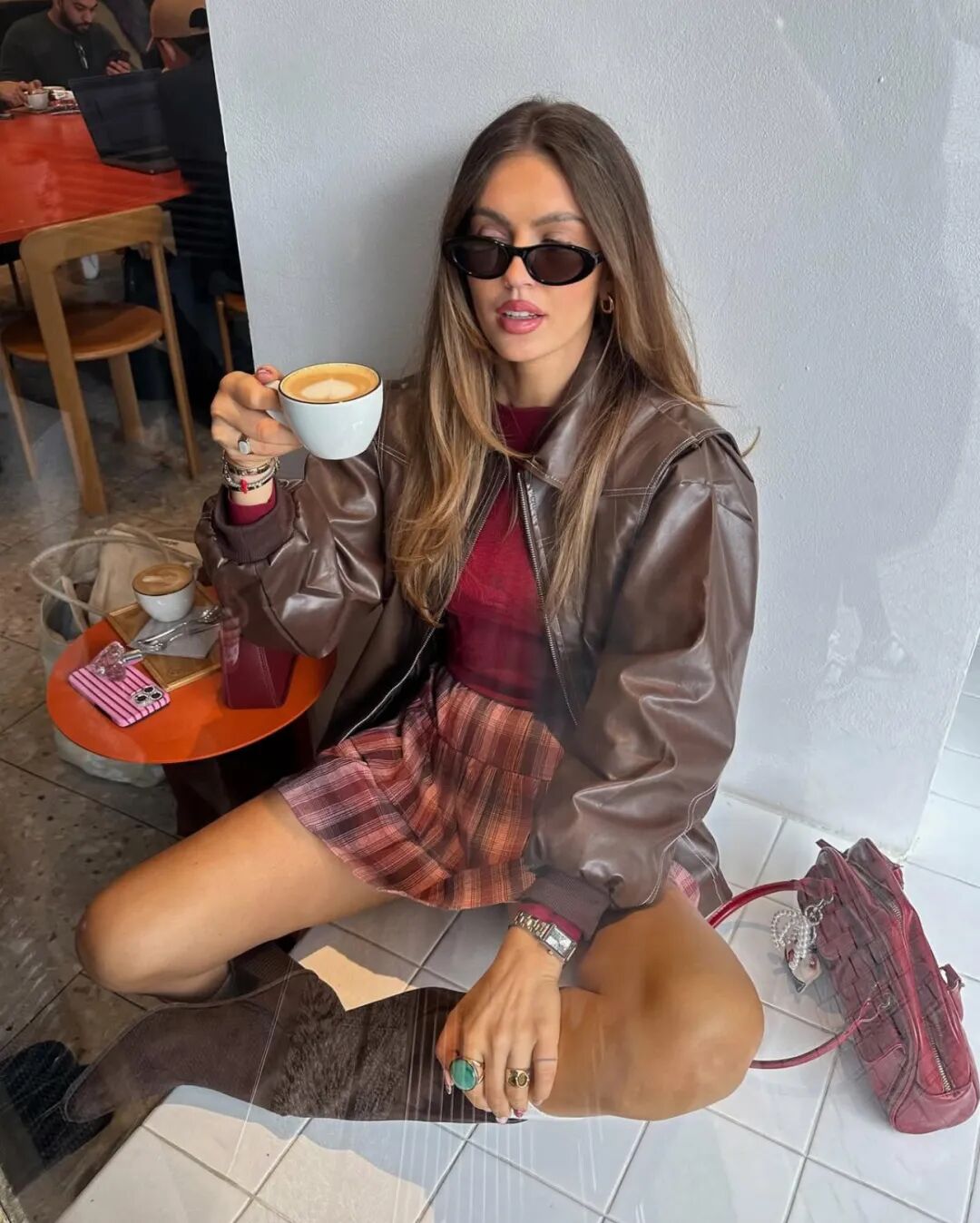 红、棕色上身,请叫我秋天氛围感的主理人。无论是乐福鞋还是小内搭,甚至是腰间系着的针织衫,浓烈的红为这个略显沉闷的季节增添了颇多活力。