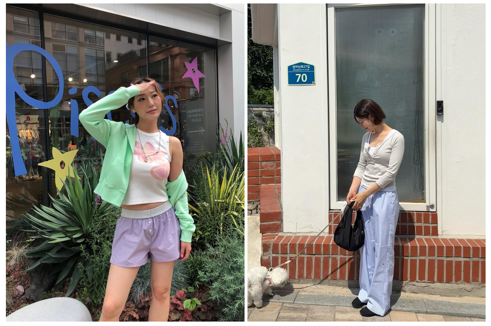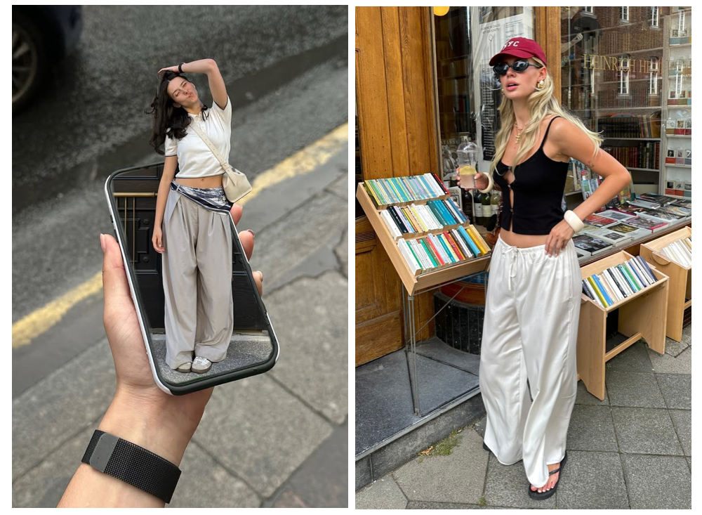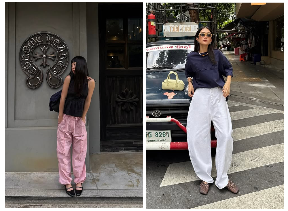即使是看似像睡裤的宽松裤装,也能轻松穿出时髦感,上身搭配一件修身或紧致的上衣,形成“上紧下松”的对比,凸显身形轮廓,将居家般的舒适感无缝融入日常的穿搭中。