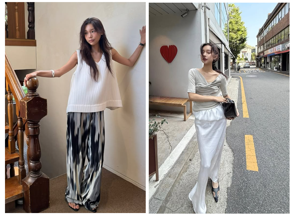 如果想让造型如水般流动,可以选择带有波光粼粼效果的上衣或裙装,面料随身体曲线自然荡漾,形成一种波浪,也可以挑选宽松的飘逸款式,动态中尽显行云流水般的松弛流动之美。