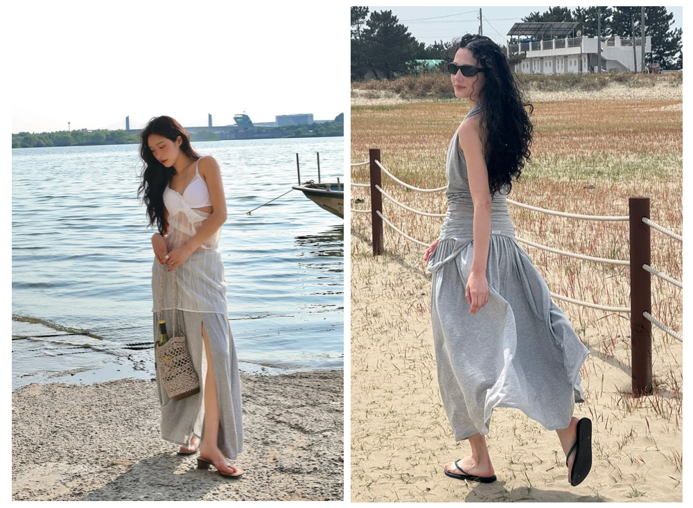 纯灰色与白色是经典的清爽拍档,两者搭配,既保留了白色的纯净底色,又融入了灰色的优雅与沉静,整体造型干净利落,毫不单调。穿着灰色时,选择带有清透感或细腻光泽感的面料,可以打破灰色潜在的沉闷感。