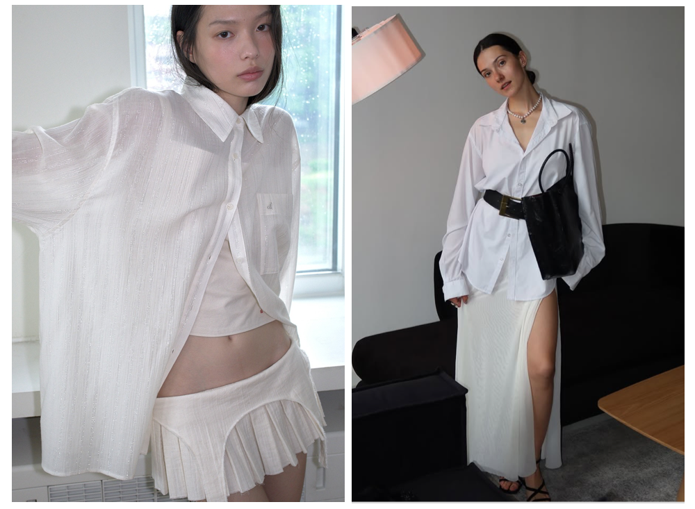 一件通透的廓形衬衫,可以在慵懒与利落间找到一种轻松的平衡,解开领口下方的纽扣,任衣摆潇洒垂落,或选择深V领口衬衫,让颈部线条与锁骨自然延伸,自然流露出清爽又洒脱的气质。
