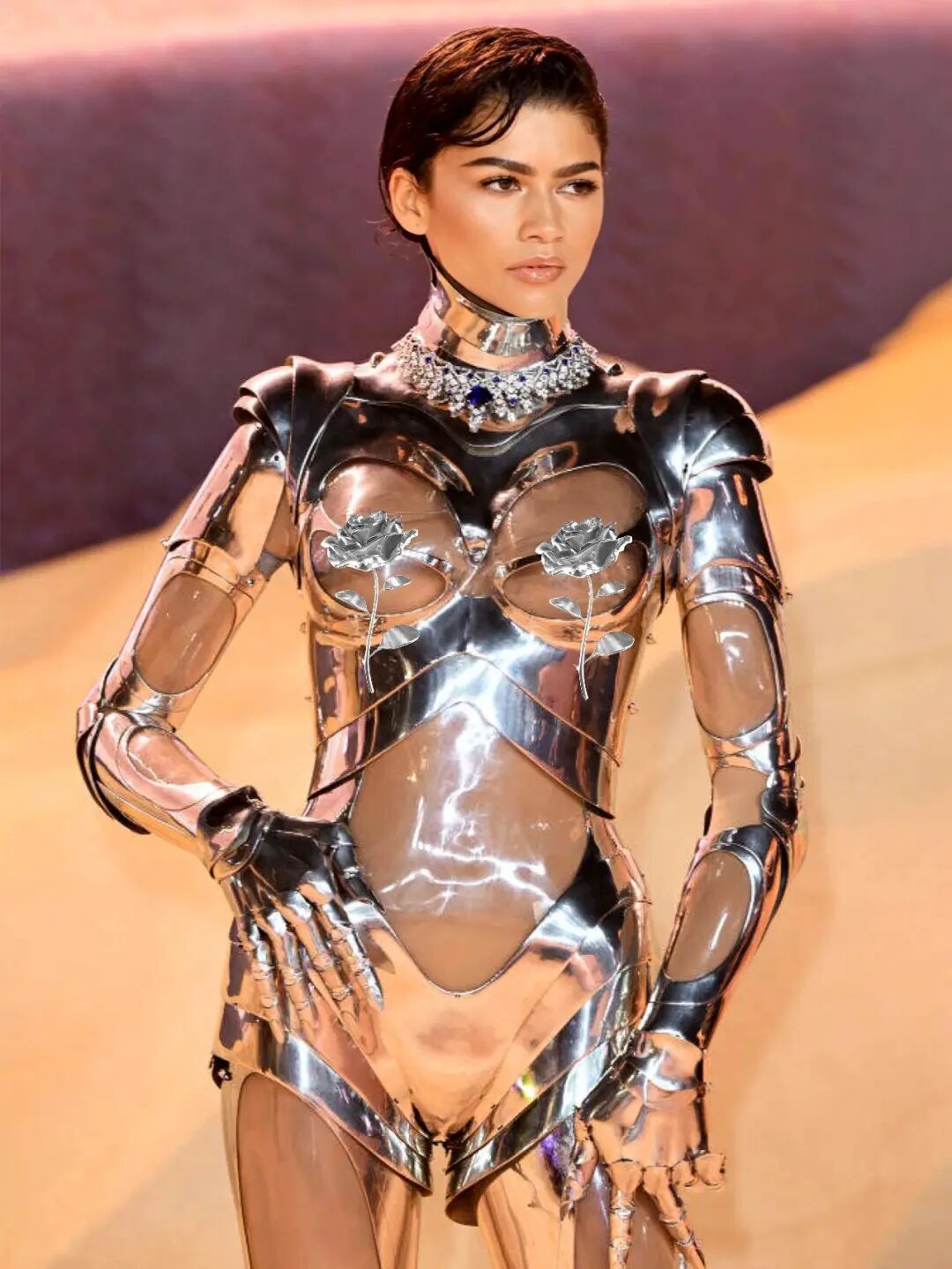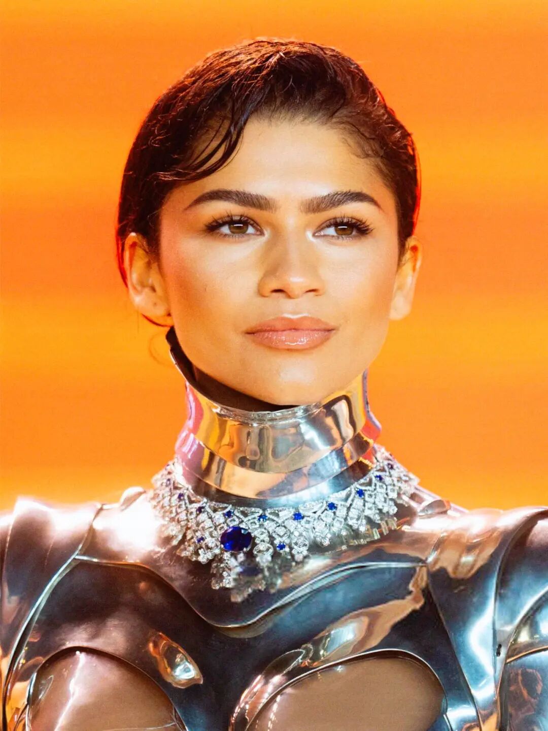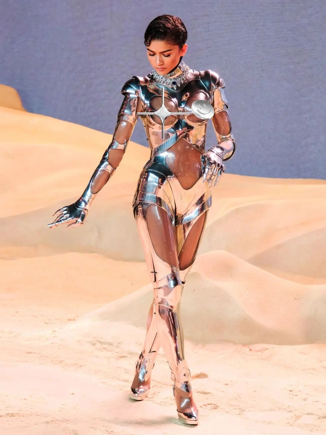 在电影《沙丘2》全球首映礼上,Zendaya身穿Thierry Mugler 1995秋冬高定,仿佛来自异世界的银色战士。