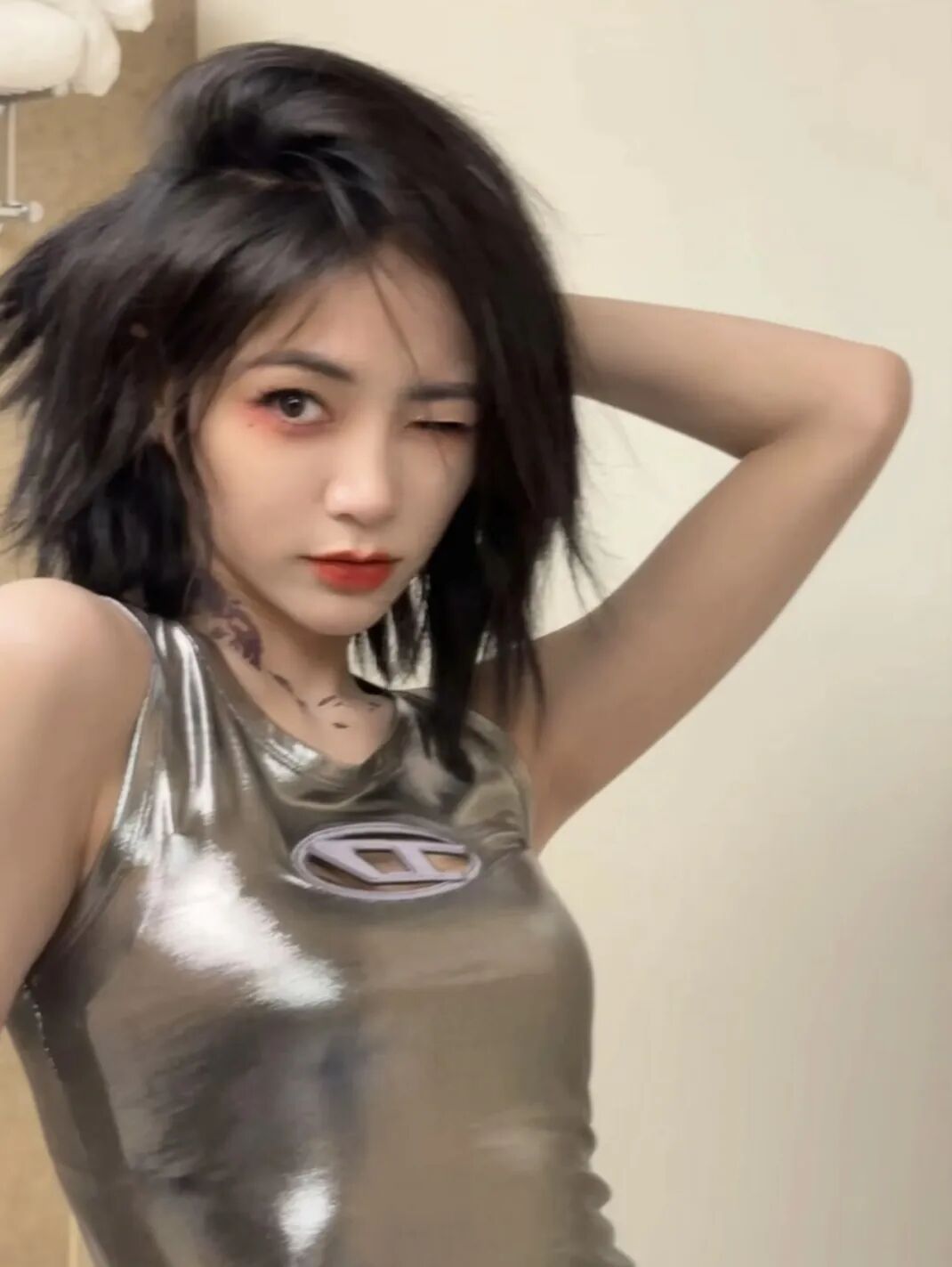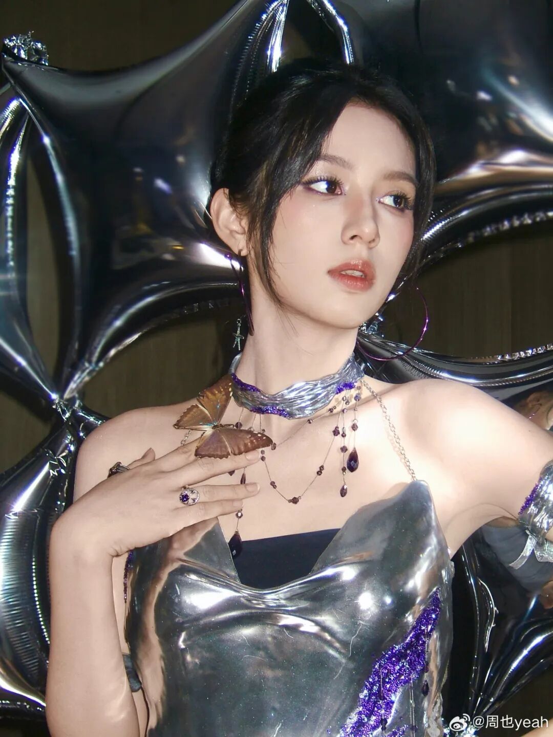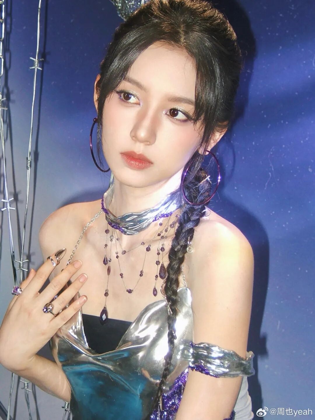 前段时间,周也出席游戏线下表演赛活动,银色金属质感的上衣搭配银色choker和眼影,赛博未来感拉满。