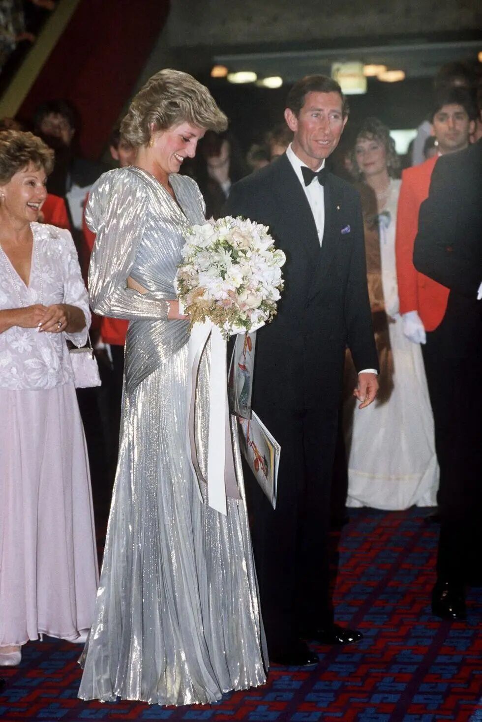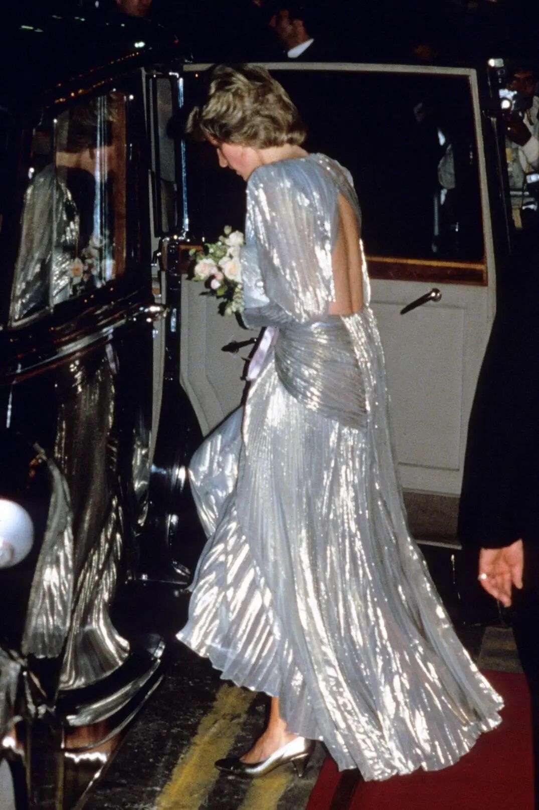1985年,戴安娜穿着银色礼服出席电影《007:雷霆杀机》首映会。